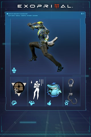 Dieses Set beinhaltet fünf kosmetische Objekte für den Sturm-Exosuit Zephyr – bekannt dafür, Gegner mithilfe seiner überlegenen Mobilität elegant zu erledigen. Diese Wache nimmt alle Arten von Gefahr augenblicklich wahr! Lege diese kosmetischen Objekte an und gewährleiste die Sicherheit deiner Teammitglieder!