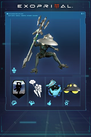 Dieses Set beinhaltet fünf kosmetische Objekte für den Unterstützungs-Exosuit Witchdoctor – bekannt für seine brutalen Angriffe auf Gegner und seine Fähigkeit, Mitstreiter zu reparieren und so sein Team vor dem Untergang zu bewahren. Lege diese kosmetischen Objekte an und mache als UFO das Schlachtfeld unsicher. Aufsehen garantiert!