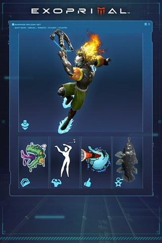 Skins, Aufkleber und Amulette sind kosmetische Objekte, die das Aussehen eines Exosuits ändern und haben darüber hinaus keinen Effekt.