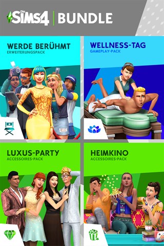 Hol dir mit einem Bundle neue Spielmöglichkeiten zum kleinen Preis*! Enthält Die Sims 4 Werde berühmt, Die Sims 4 Wellness-Tag und Die Sims 4 Luxus-Party- sowie Die Sims 4 Heimkino-Accessoires. Erzähle Geschichten über den neuen Ruhm deiner Sims, entspanne dich im Wellnesscenter, feier luxuriöse Partys und sieh dir Filme mit anderen Sims an.