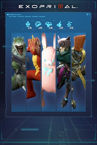 Dieses Paket enthält den/die/das folgende/n Exosuit-Skin / Aufkleber / Emote / Marke / Amulett in der angegebenen Reihenfolge.