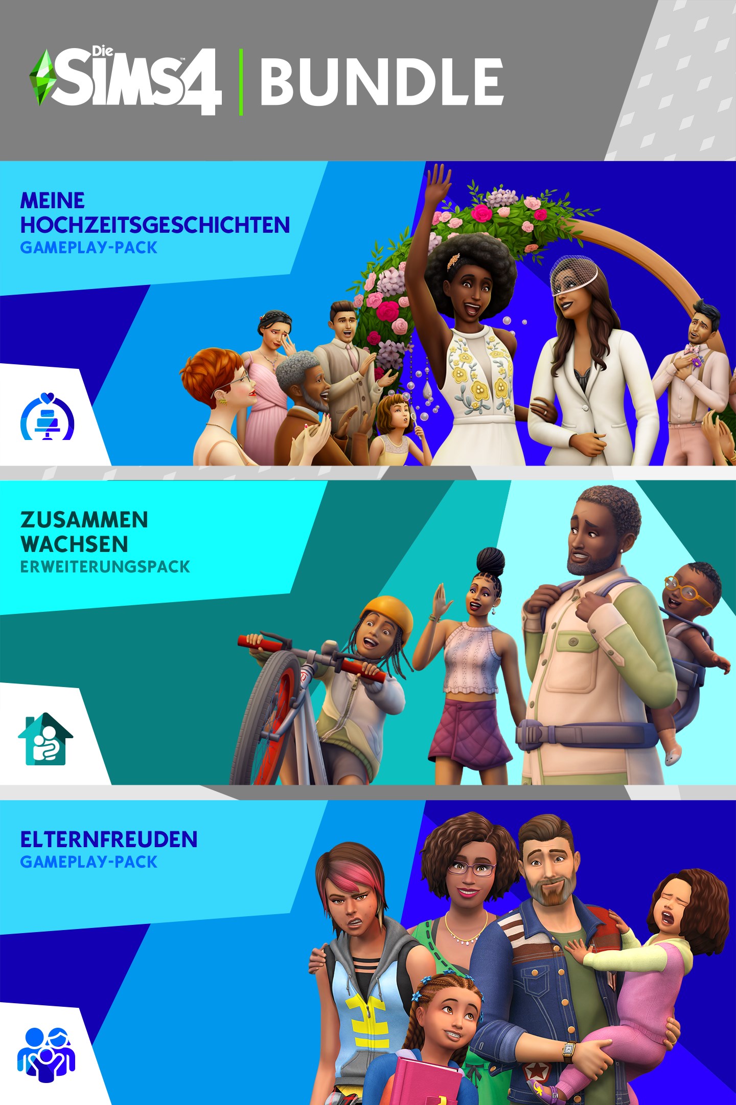 Erlebe die Freuden und Herausforderungen einer Partnerschaft und des Familienlebens mit dem Die Sims™ 4 Meine Hochzeitsgeschichten-Gameplay-Pack*, Die Sims™ 4 Elternfreuden-Gameplay-Pack* und Die Sims™ 4 Zusammen wachsen-Erweiterungspack*. Plane die perfekte Hochzeit und sei bereit, dich als Paar den Herausforderungen des Lebens zu stellen – von der Kindererziehung bis zum Navigieren von Familiendynamiken.