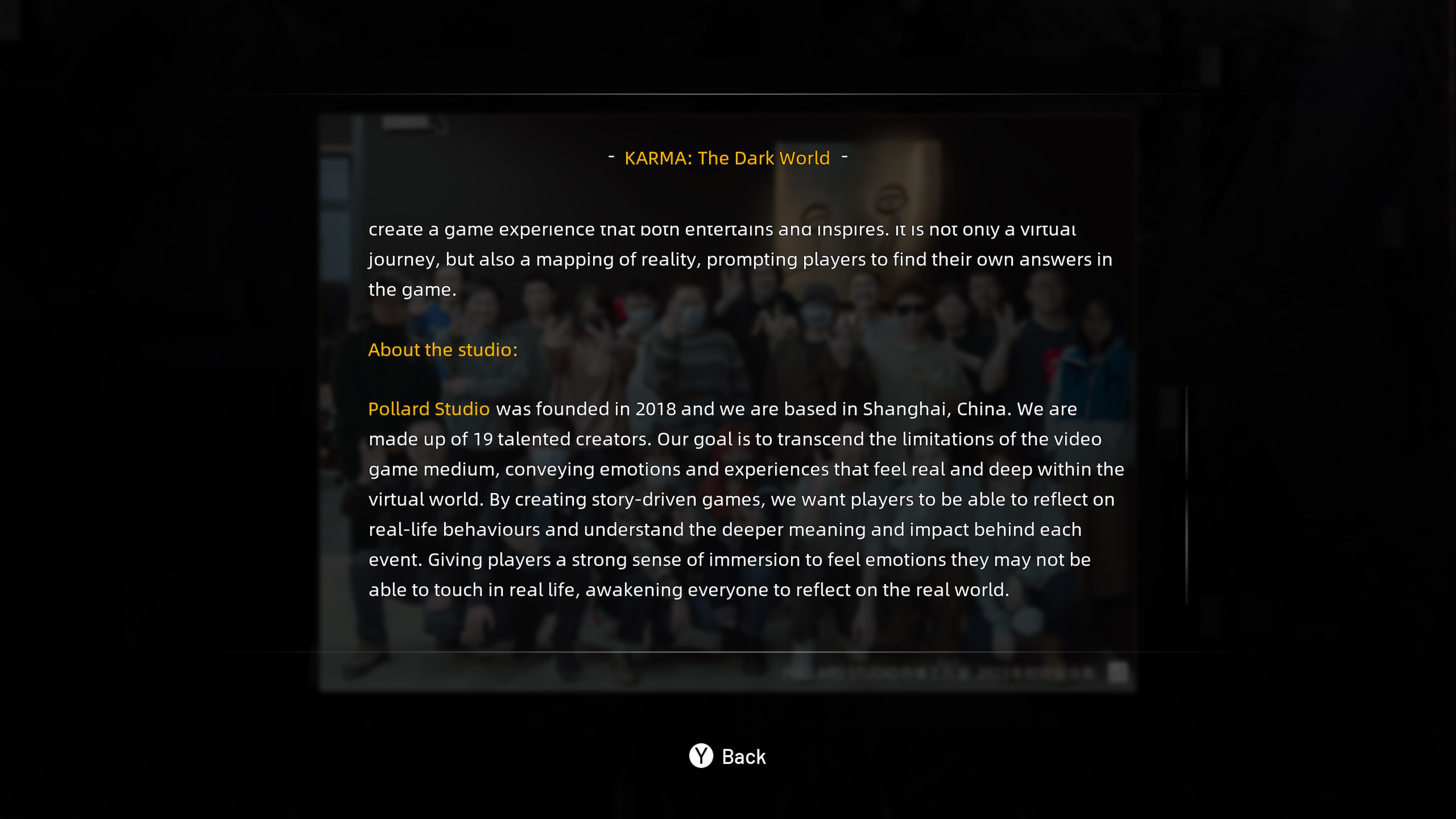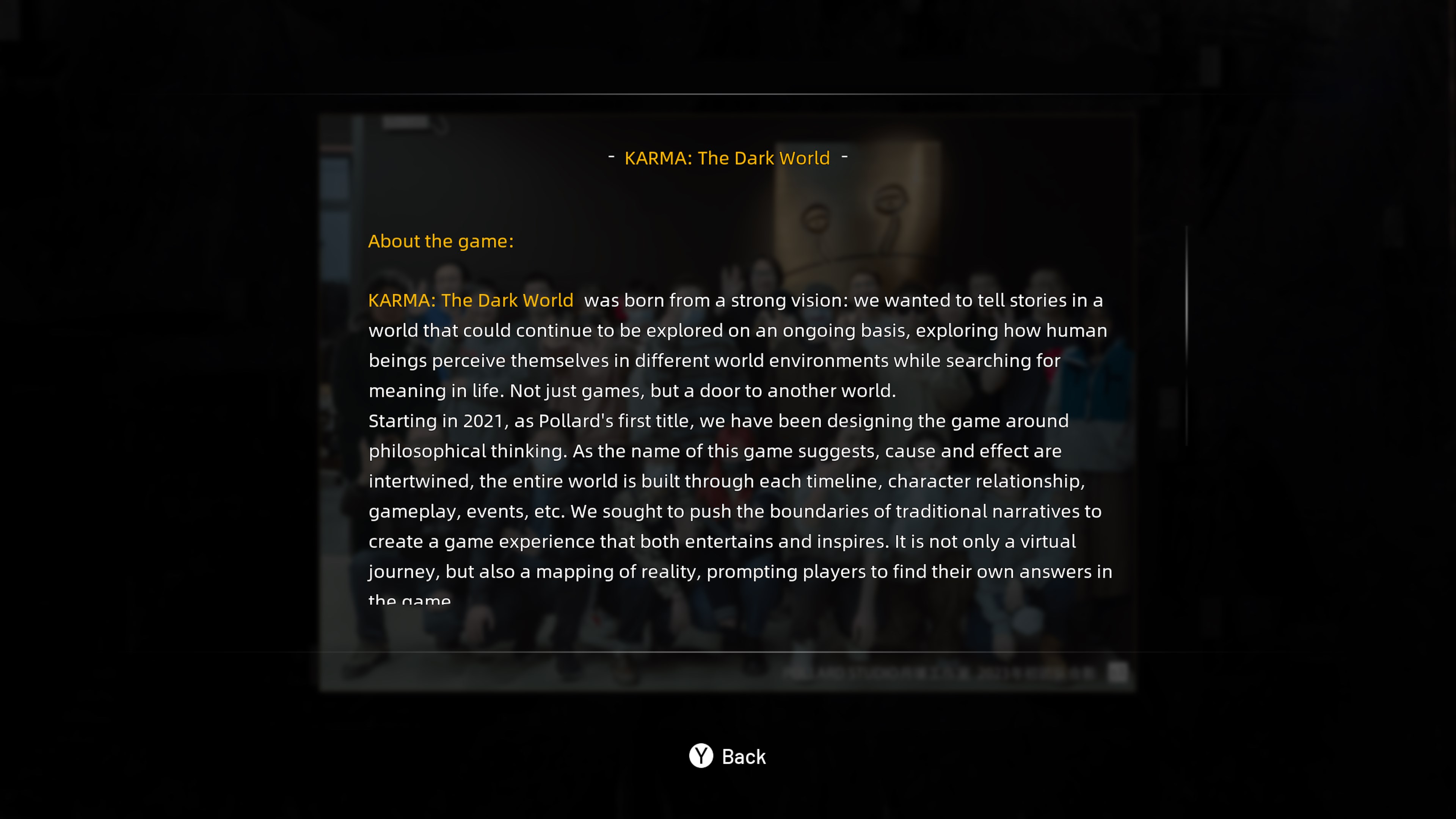 Dieses Artbook beschreibt die Entstehung von KARMA: The Dark World und gibt Informationen über Pollard Studio und darüber, wie das kleine Indie-Team aus China die Kunst von der Konzeptskizze bis zum fertigen Spiel entwickelte.