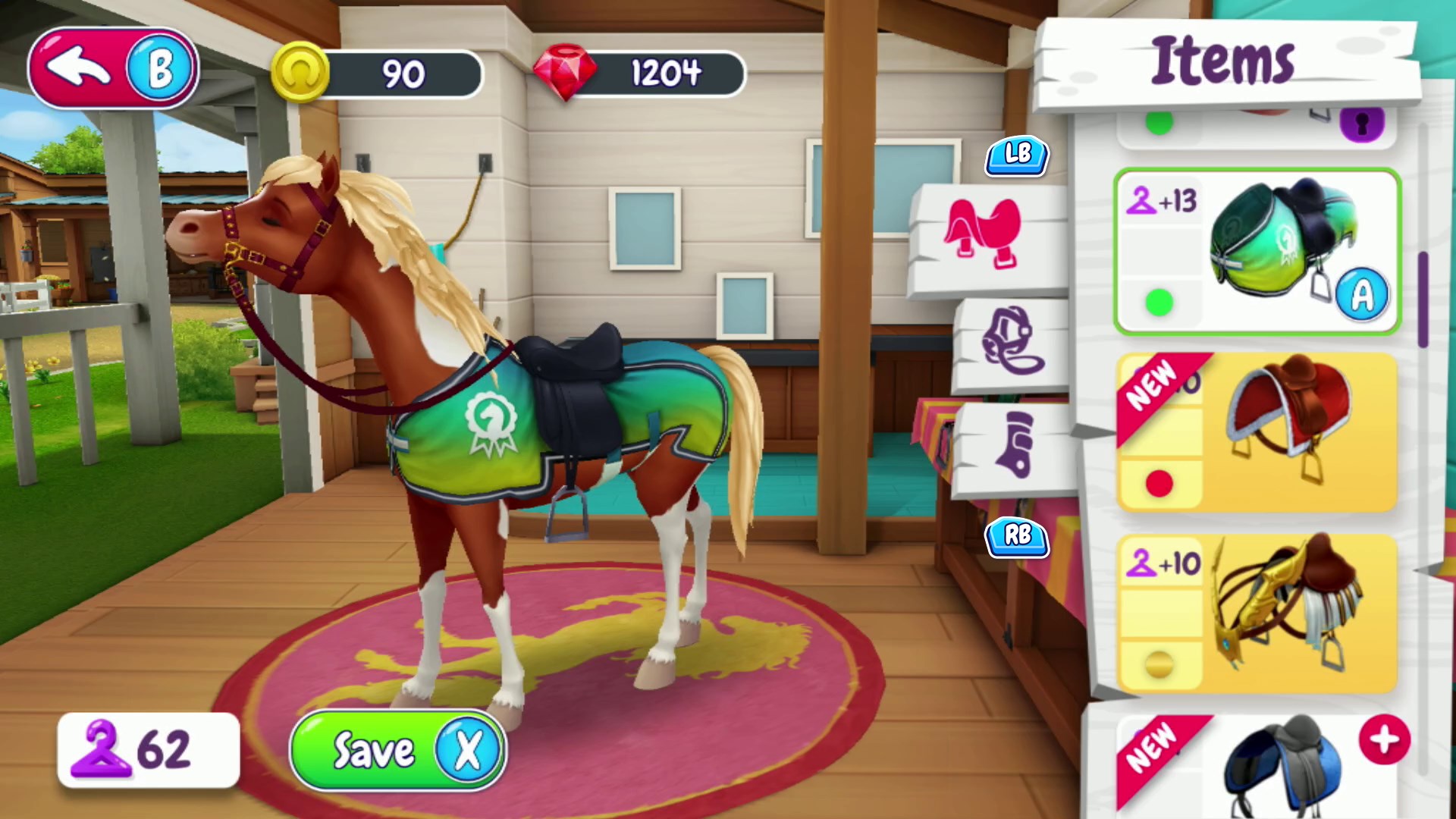 - grün-blau-gelbe Pferdebekleidung und einen schwarzen Sattel