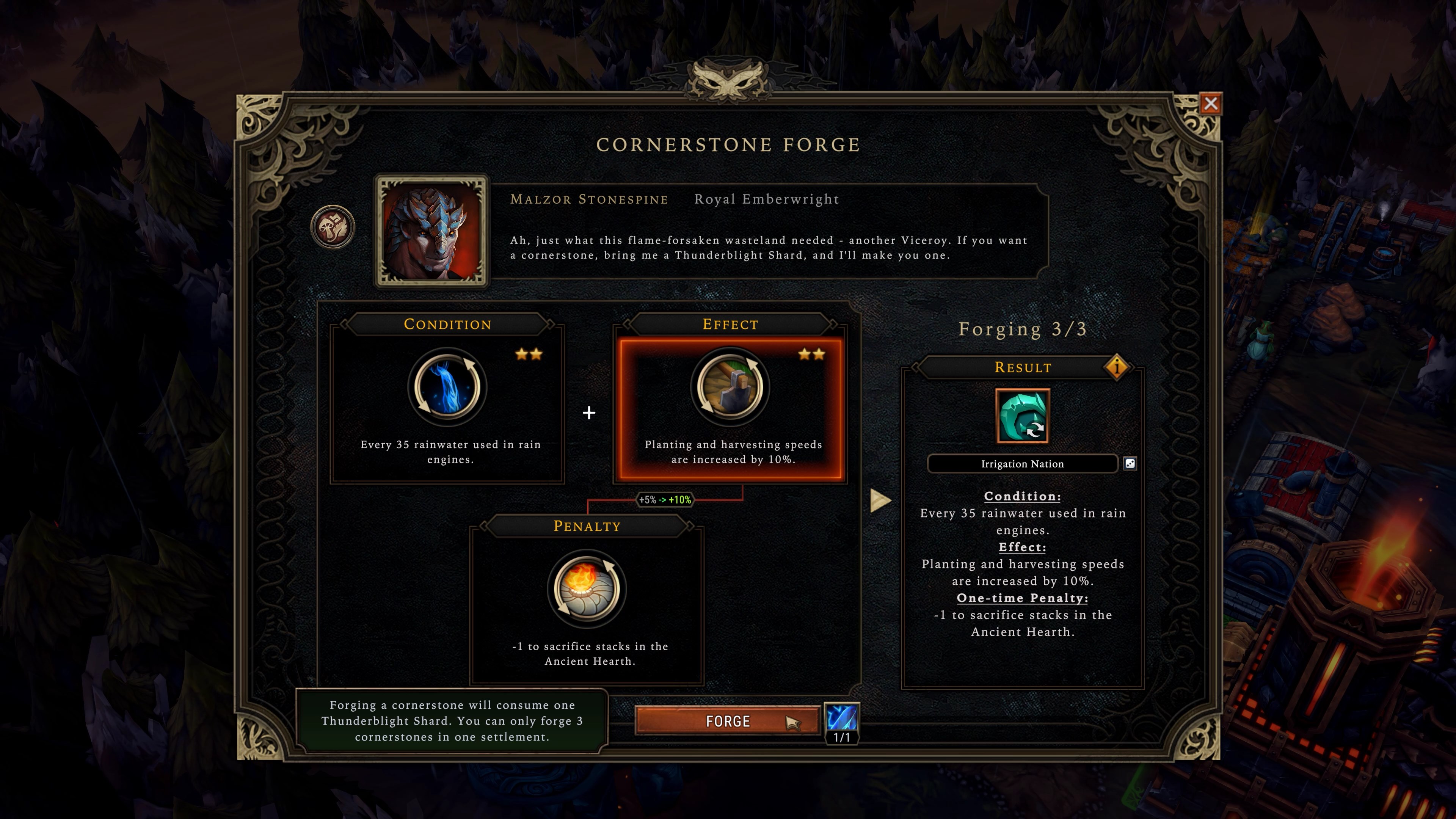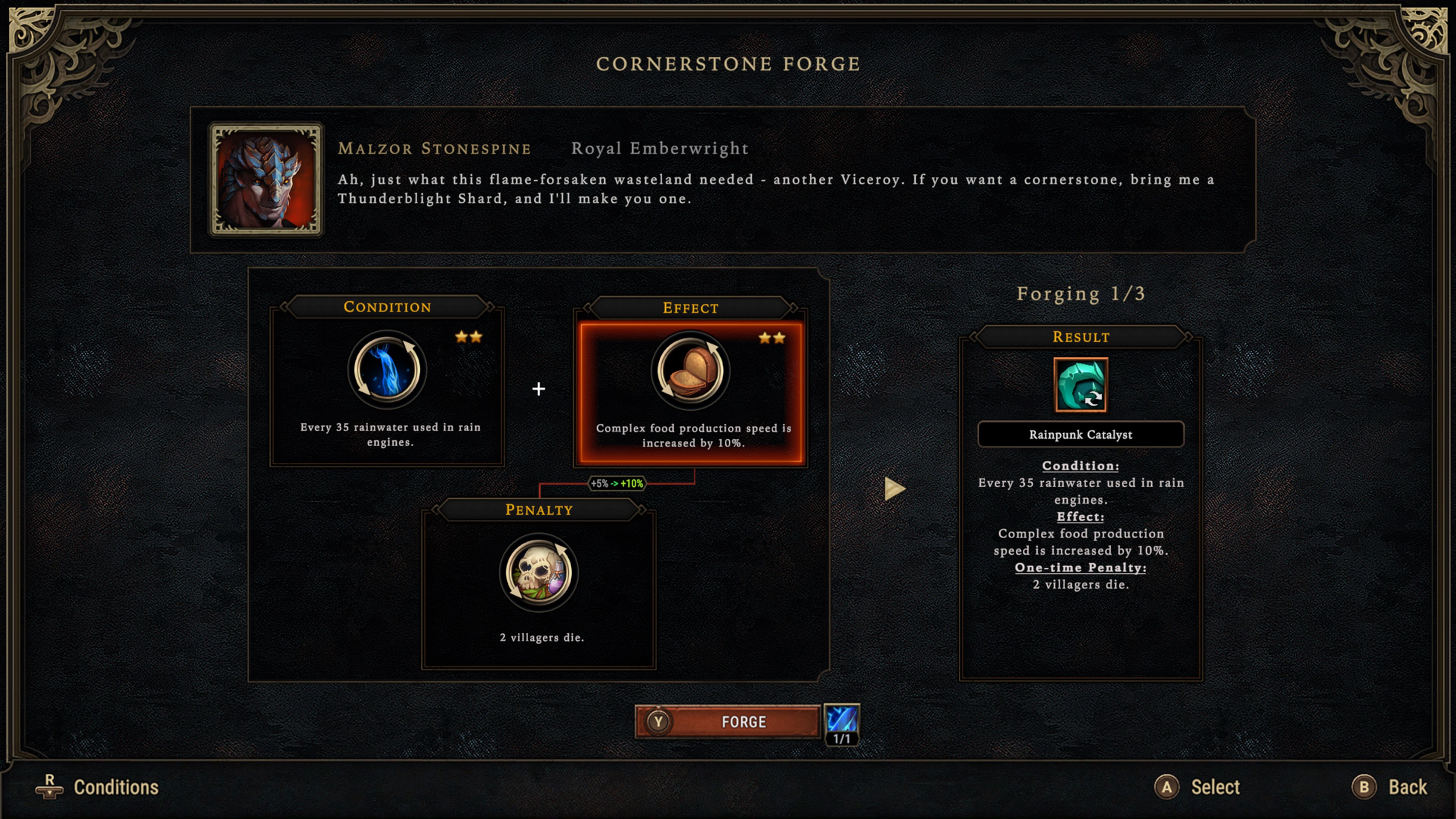 - Wage dich in ein völlig neues Biom, das Aschene Dickicht, das von der industriellen Ausbeutung und dem Peststurm gleichermaßen verwüstet wurde. Das öde Land ist Heimat der seltenen Donnerfäulesplitter - von Blitzen durchzogener Kristalle, die zu einem hohen Preis abgebaut werden können und aus denen sich Grundsteine schmieden lassen. Die dafür nötige Grundsteinschmiede gibt es nur im Aschenen Dickicht. Du hast aber nur wenige Möglichkeiten, eigene Grundsteine herzustellen, musst also strategisch geschickt wählen, welche Bedingungen und Belohnungen zueinander passen. Dabei kannst du immer auch einen Malus auf dich nehmen, um im Gegenzug größere Vorteile zu genießen.