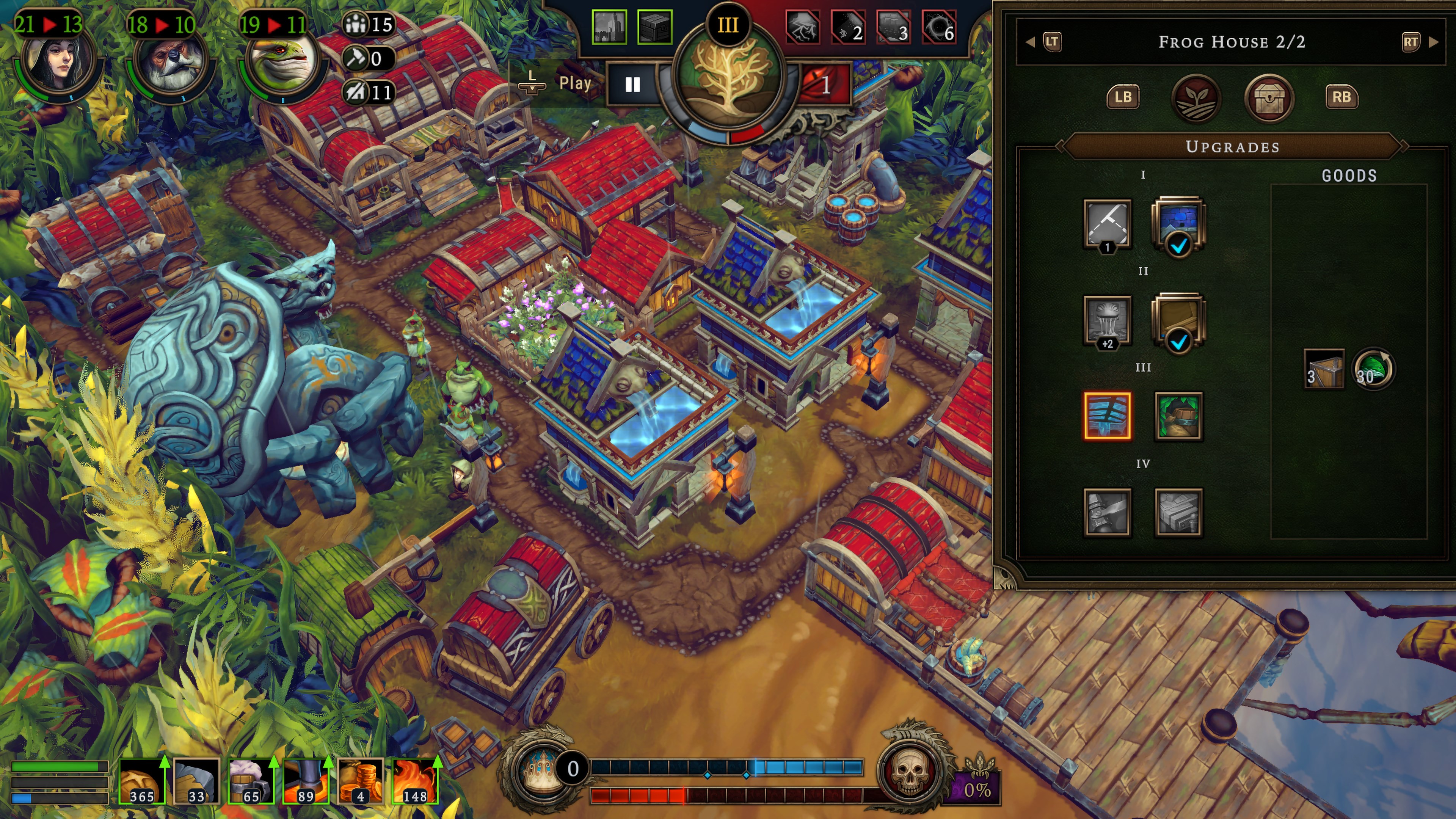 - Mit am wichtigsten ist den Fröschen geeigneter Wohnraum. In ihrem Stolz weigern sie sich, in gewöhnlichen Unterkünften zu leben. Sie verlangen den Bau eigener Froschhäuser, die sich mit zahlreichen Upgrades ausstatten lassen. Auf jeder der vier Upgrade-Stufen verändert sich die Funktionalität der Unterkünfte beträchtlich, weshalb du dich in Notlagen intensiv um den Ausbau des Wohnraums für die Frösche bemühen solltest.