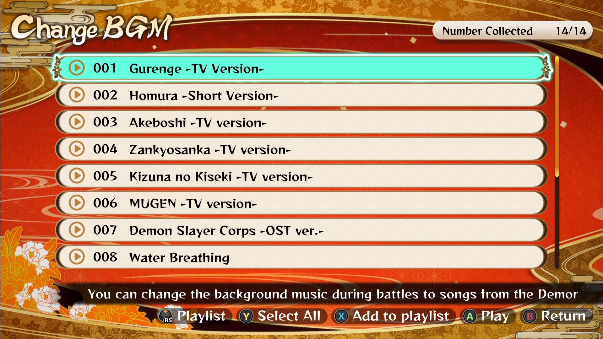 Mit diesem Paket kannst du die Hintergrundmusik in Kämpfen im Versusmodus zu den Anime Songs und Soundtracks aus dem Anime „Demon Slayer: Kimetsu no Yaiba“ ändern.