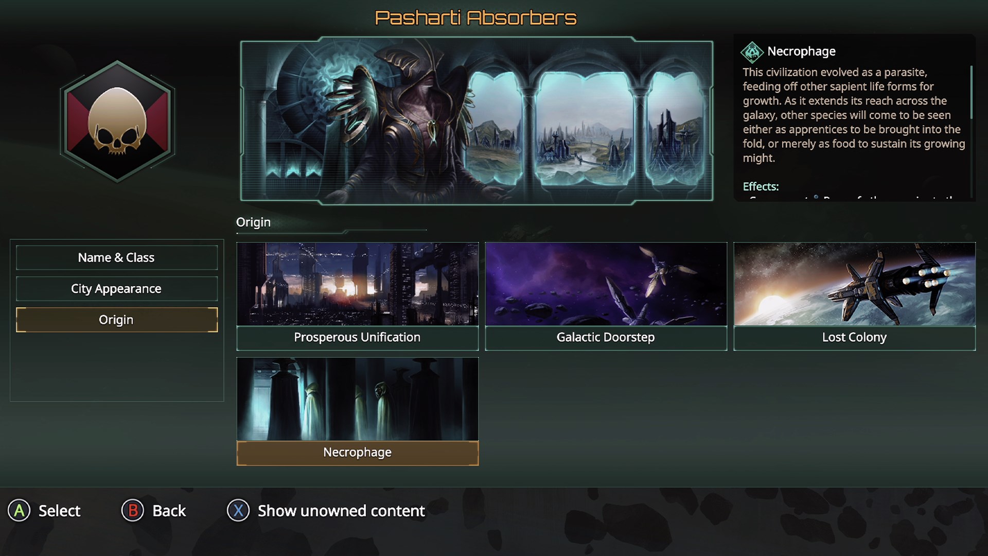 Der Nekrophagen-Ursprung bietet den Spielern eine mächtige Primärspezies, die andere ergreift und vernichtet und die die Grenze zwischen Kult und Imperium mithilfe von drei einzigartigen Staatselementen verwischt. Kosmetische Änderungen generieren Spieldurchgänge von Stellaris für langjährige Spieler neu, wobei Killerimperien neues Leben eingehaucht wird. Das Necroids Species Pack umfasst: