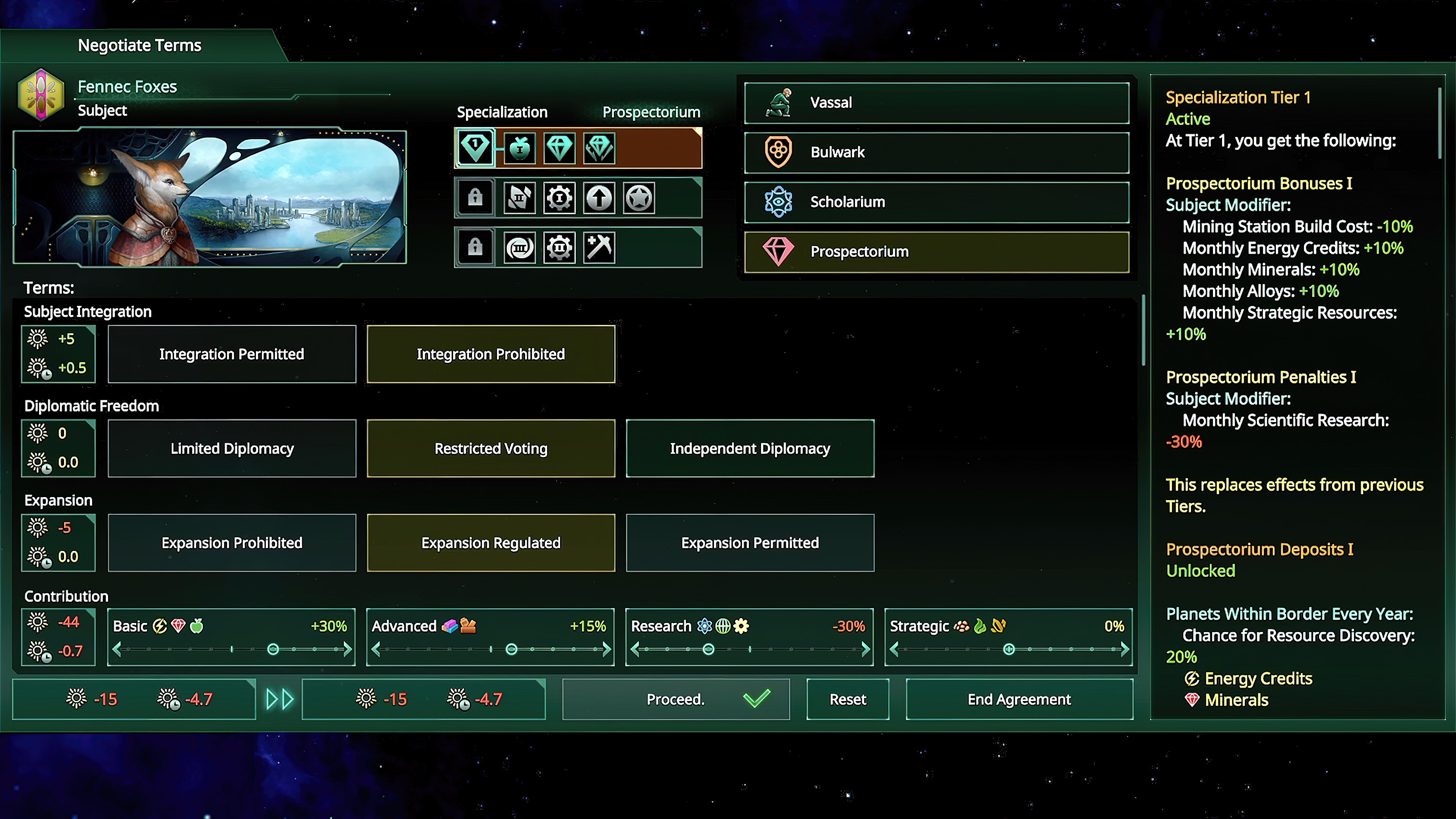 · Neue Vasallenregeln ermöglichen dir, die Rolle deiner neuen Untertanen zu bestimmen: Gründe neue spezialisierte Imperien, die sich zu wirtschaftlichen Supermächten, Militärspezialisten oder Technologieschöpfern entwickeln. Verhandle oder verlange Verträge und Abkommen zwischen deinen Vasallen, um die Zukunft Dutzender von Welten zu bestimmen – und profitiere von den Vorteilen!