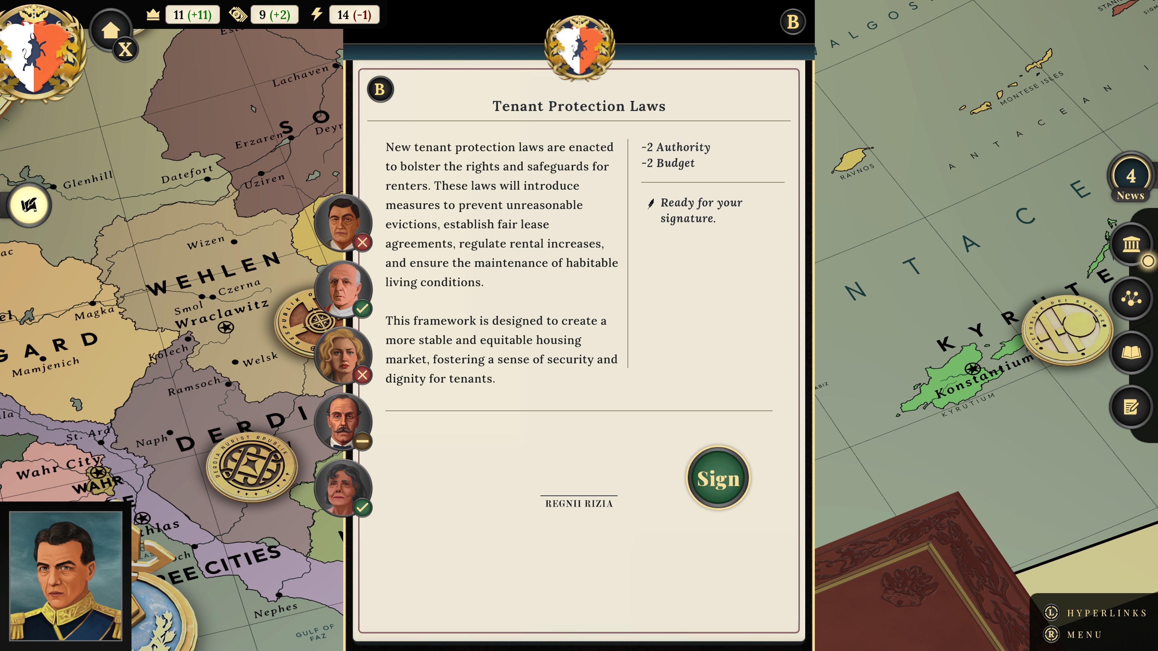 Baue deine Nation auf: Unterzeichne Dutzende königlicher Erlasse zu Themen wie Ordnung, Wirtschaft und Wohlfahrt, um Rizia zu entwickeln und zu verbessern. Wirst du der Hüter des Friedens oder der Katalysator für Konflikte sein?