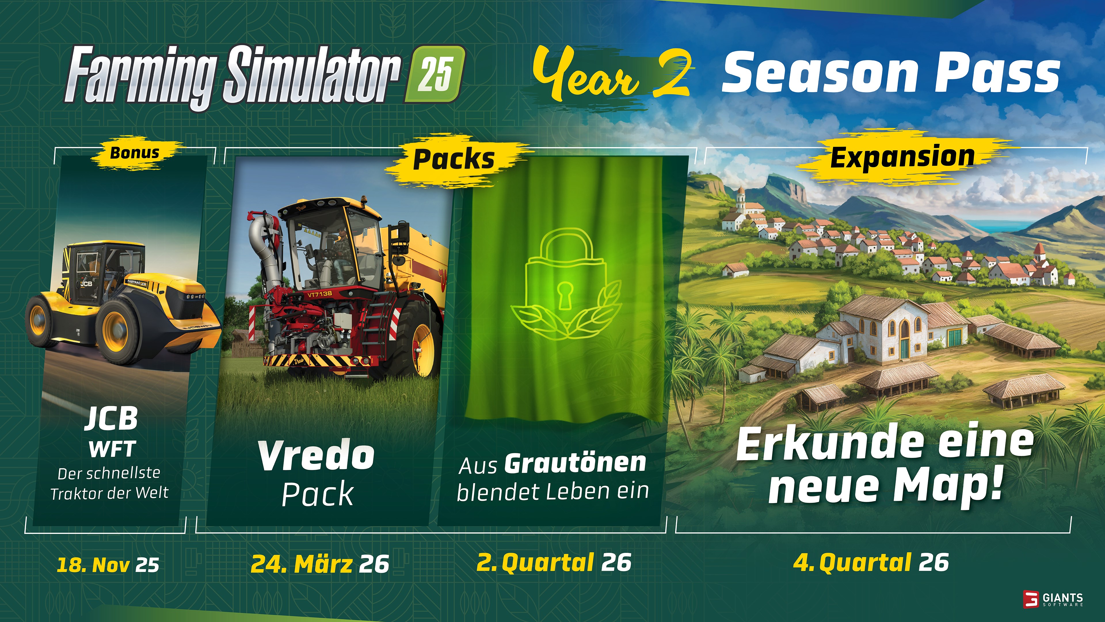 Macht euren Hof noch größer: mehr Maschinen, mehr Marken, frisches Gameplay und eine brandneue Umgebung, um euren Betrieb auszubauen. Der Year 2 Season Pass umfasst zwei offizielle Packs und eine große Erweiterung von GIANTS Software.