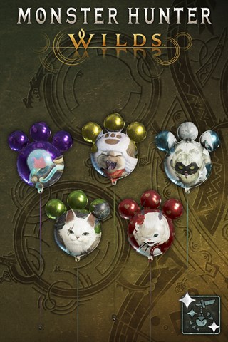 Ein Set von Anhängern mit Ballons, die wie Palicos mit ihrer Ausrüstung aussehen.