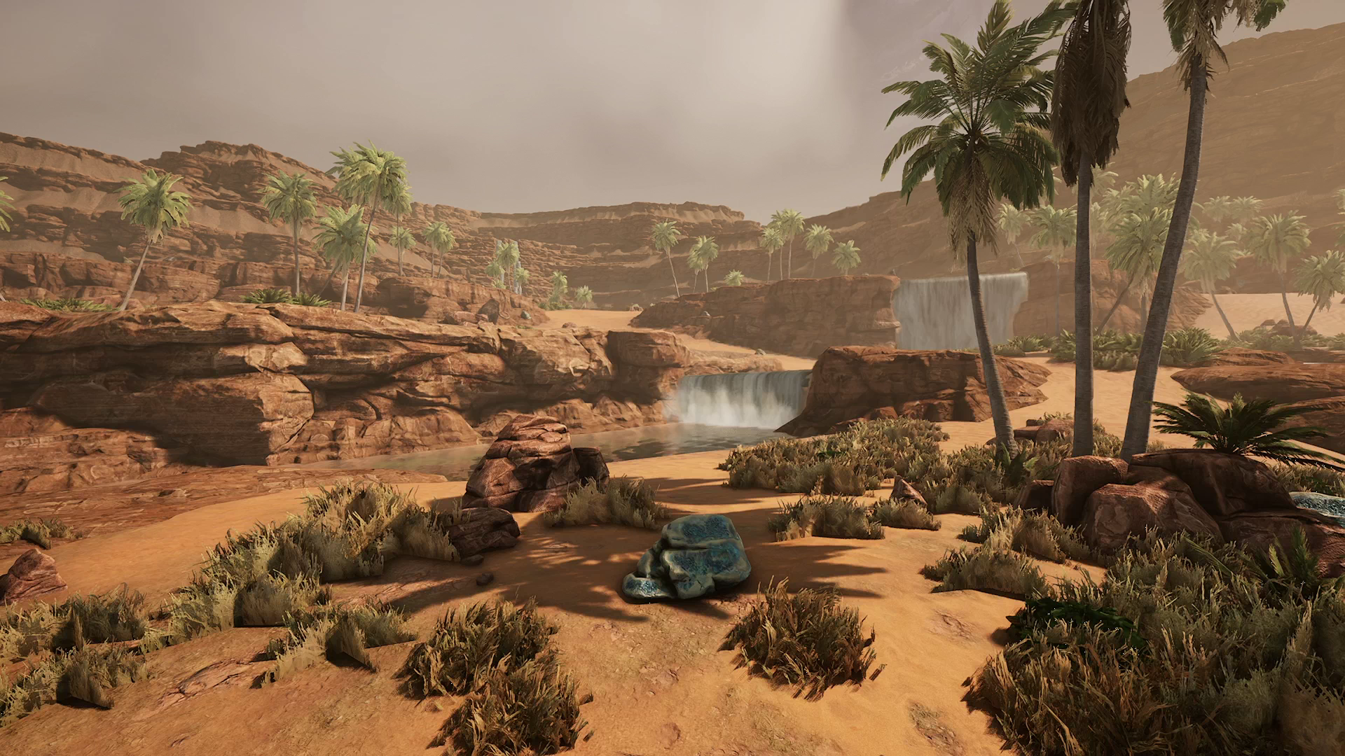 - Zwei Wasserfälle stürzen sich im Norden über Sand und Felsen die Klippe hinunter und bieten Platz, um deine Basis um sie herum zu errichten
