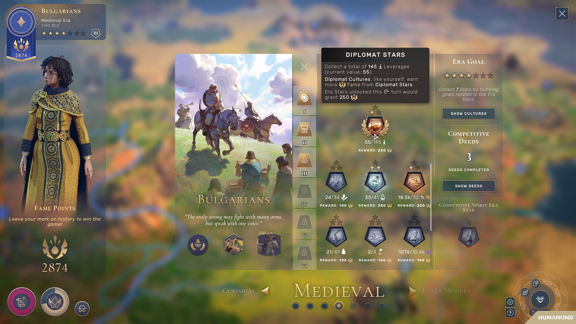 Diese Affinität führt mit den Diplomatie-Sternen auch eine neue Möglichkeit ein, Ruhm zu erlangen, indem man Druckmittel in jeder Epoche sammelt.