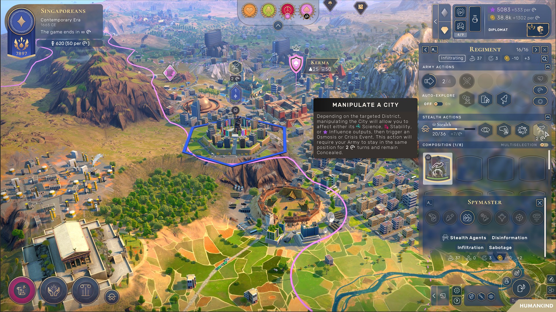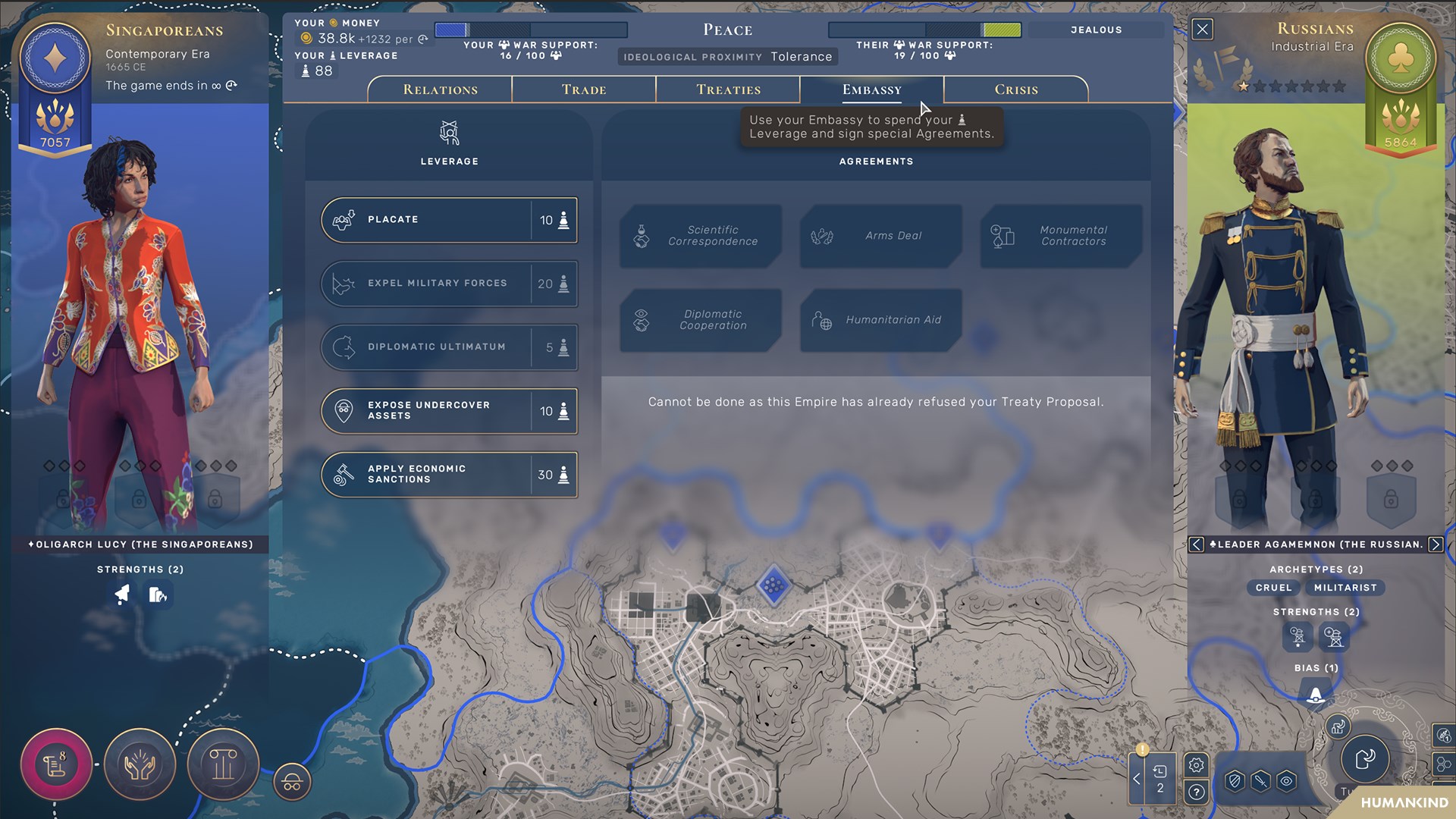 Sammle Informationen durch offensive Infiltrierung und Geheimagenten, baue Botschaften auf, um internationale Verbindungen zu vertiefen und lenke die globalen Beziehungen zwischen allen Reichen über den Humankind-Kongress. Ganz zu schweigen von 6 neuen Kulturen mit Diplomatischer Affinität!