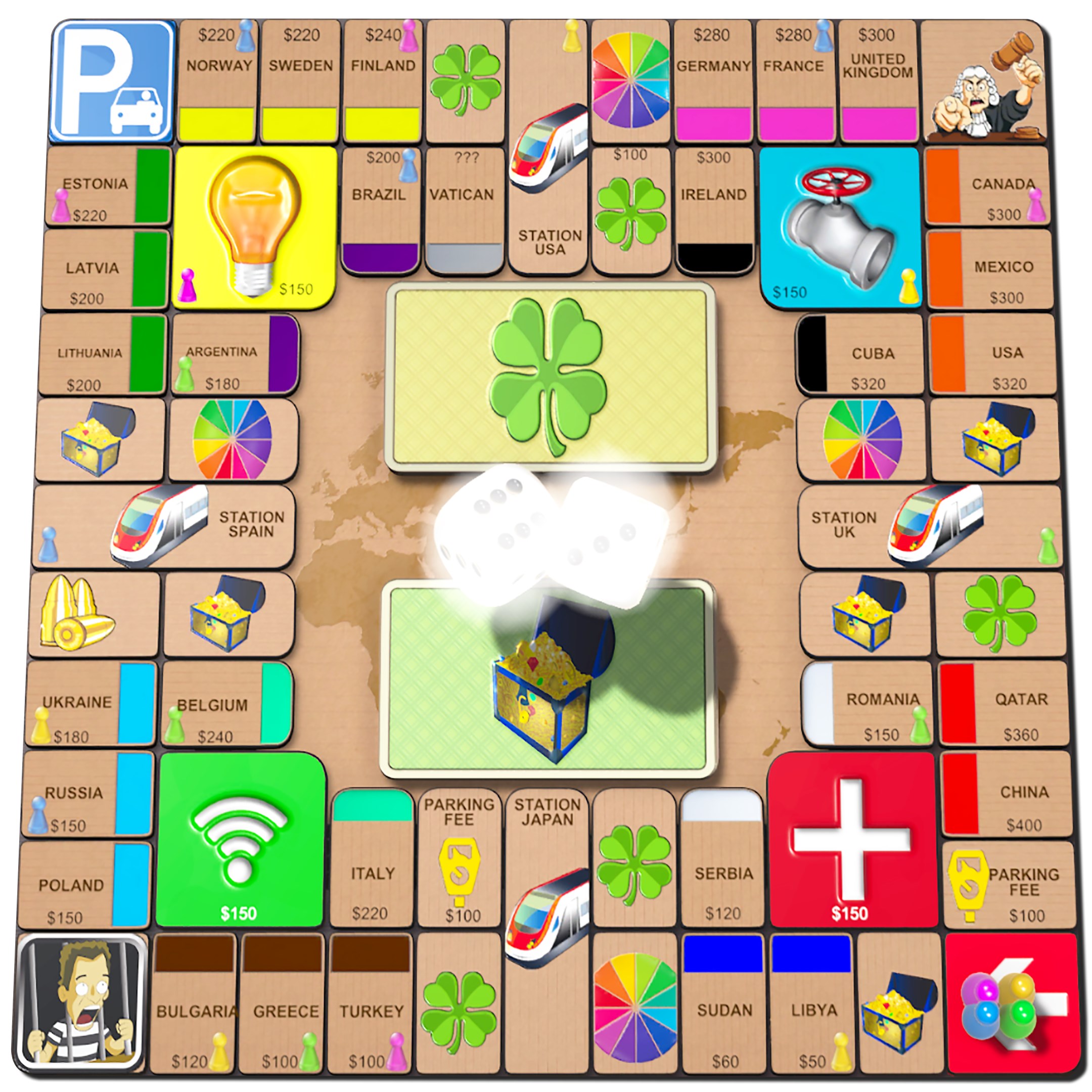 Erlangen Sie das Monopol auf dem Spielbrett und machen Sie die anderen Spieler bankrott, um zu gewinnen.
