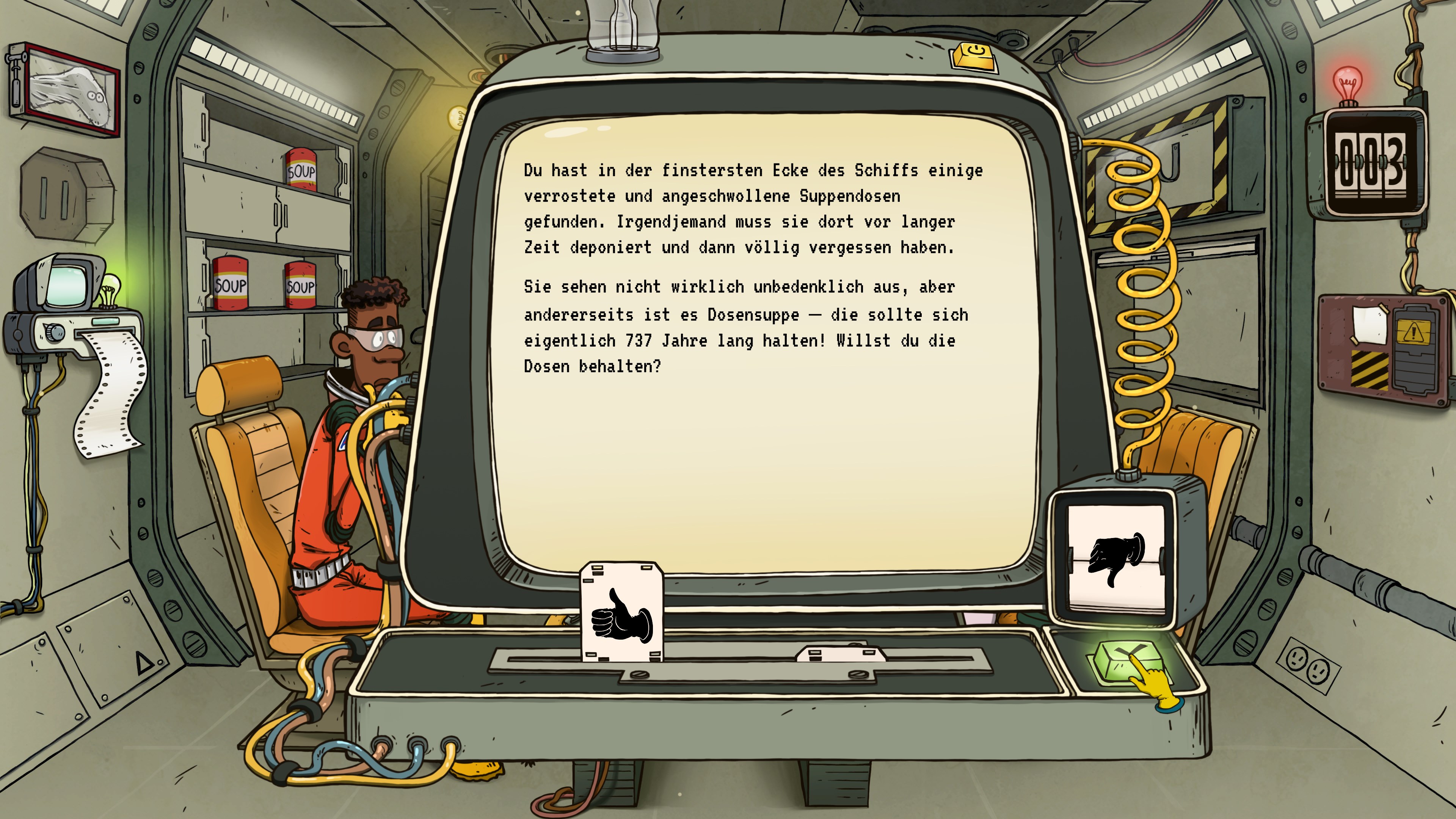 Führe eine Besatzung von völlig unvorbereiteten Astronauten an, ausgerüstet mit allem möglichen Zeugs – Entschuldigung – Vorräten, die du mitnehmen kannst, bevor du dich auf eine Reise durch den Kosmos begibst, die am besten als „fehlgeleitet“ beschrieben werden kann. Mach das Beste daraus und stell dich der Suppenknappheit und anderen Schrecken des Weltalls. Hast du das Zeug dazu, ein neues Zuhause zu finden und zu überleben?