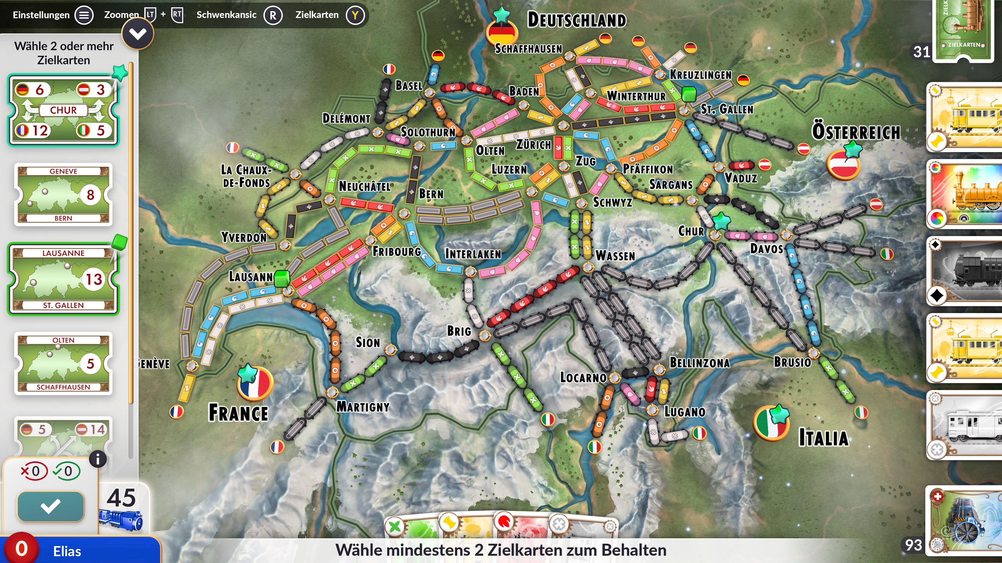 Genießen Sie die atemberaubenden Anblicke von Mutter Naturs eigenem Meisterwerk, während Sie sich Ihren Weg über die bisher wettbewerbsintensivste Karte von Zug um Zug – die Schweiz-Erweiterung – strategisch erarbeiten! Verbinden Sie die Nachbarländer der Schweiz, während Sie mit zwei brandneuen Charakteren reisen.