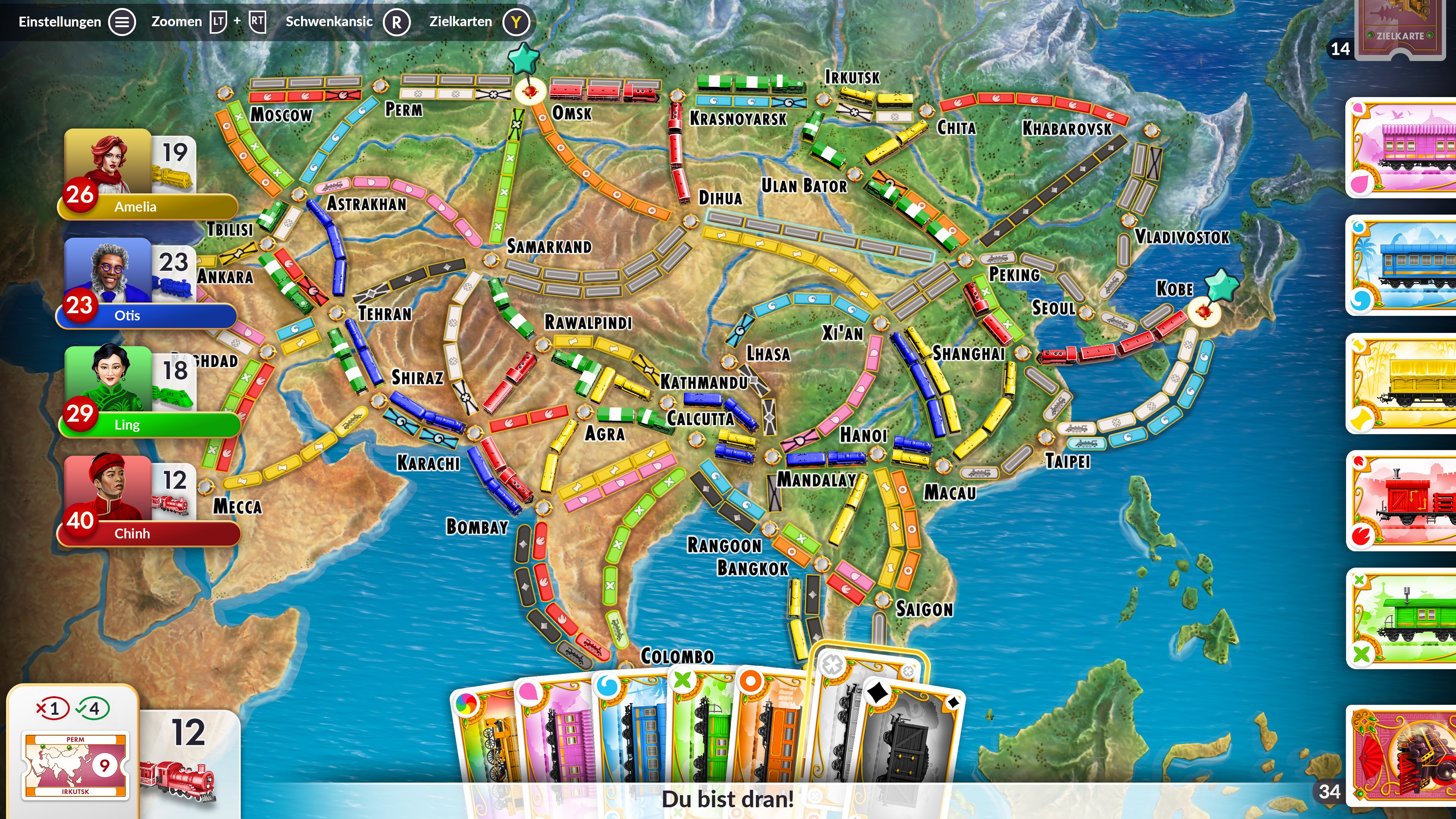 Begeben Sie sich auf ein Abenteuer in Indien! Neue Charaktere, Lokomotiven und Waggons erwarten Sie auf dieser lebendigen Karte. Überdenken Sie Ihre Strategien und überlegen Sie über einzelne Strecken hinaus, während Sie den schwer fassbaren Mandala-Bonus jagen, der für das Abschließen von Tickets auf verschiedene Arten vergeben wird!