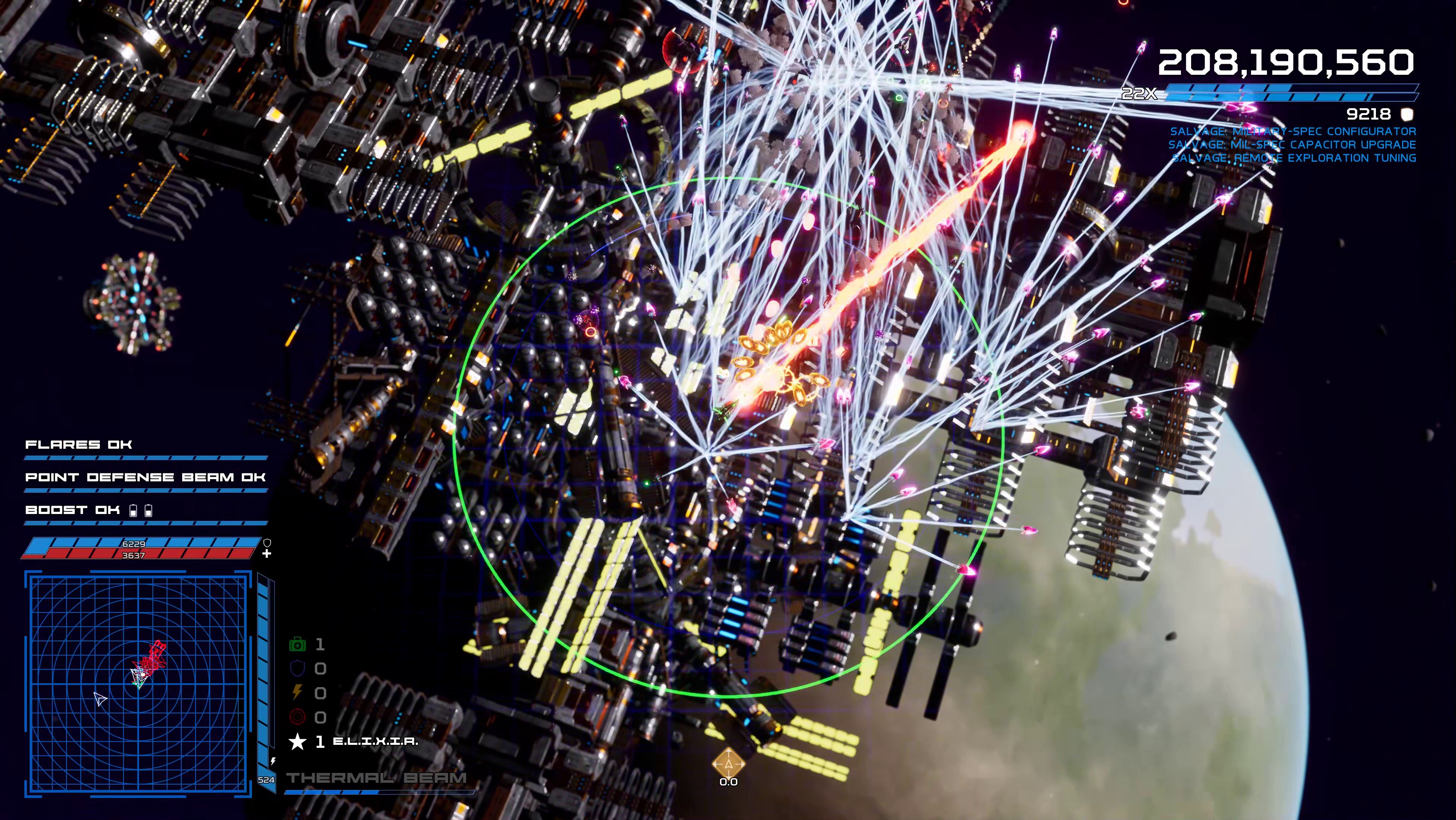 Das Spiel verfügt über einen Original-Soundtrack von Levente Reti (plus zwei Songs vom Entwickler!), der die Action auf eine ganz andere Ebene hebt, mit einer Vielzahl von rasanten Level-Tracks, intensiven Boss-Themen und einigen coolen Melodien, mit denen man sein Schiff zwischen den Levels aufrüsten kann.