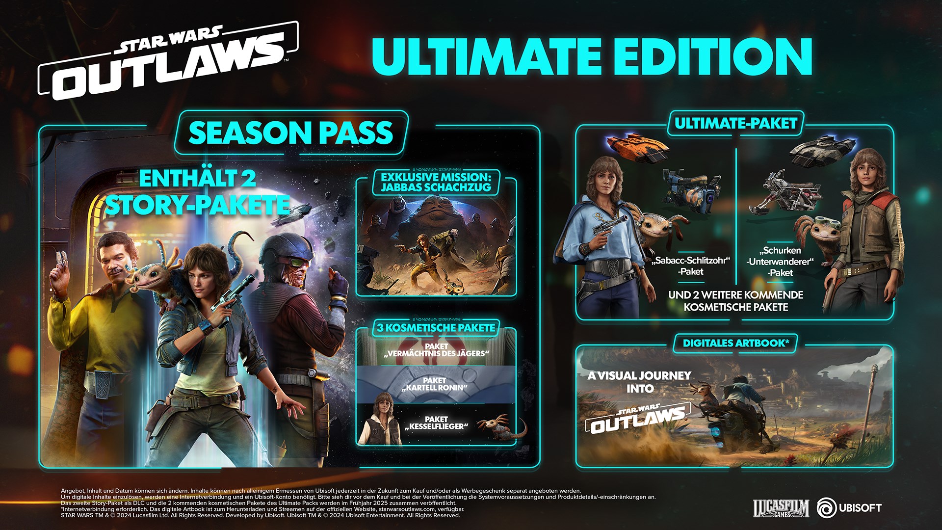 Hol dir Zugriff auf die DLCs „Star Wars Outlaws: Wild Card“ und „Star Wars Outlaws: A Pirate's Fortune“, die exklusive Mission „Jabbas Schachzug“ (ab Tag 1) und das Charakterpaket „Kesselflieger“, alles im Season-Pass.