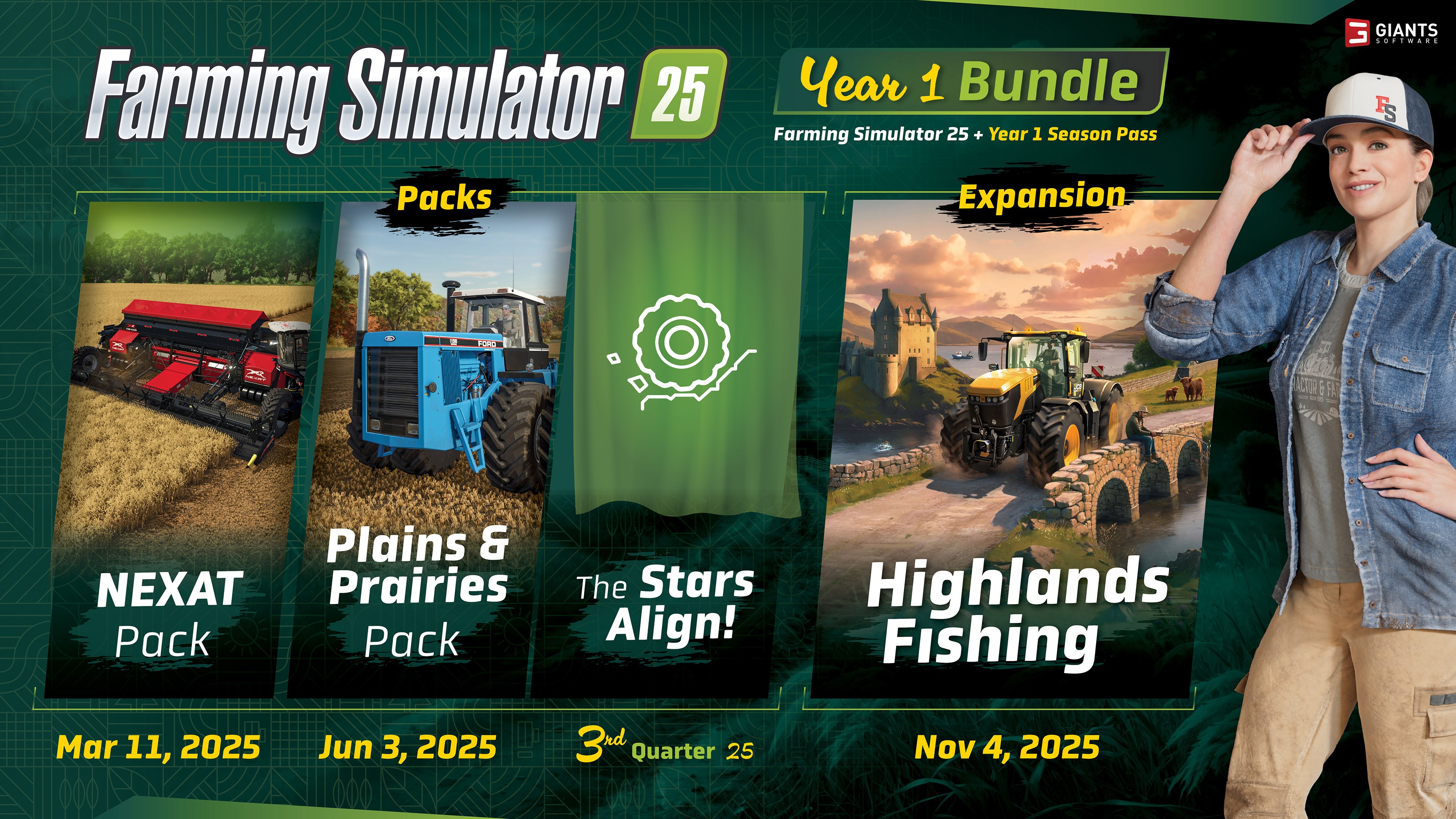 Erweitere deinen Landwirtschafts-Simulator 25 mit neuen Maschinen, Marken, Spielinhalten und einer völlig neuen Umgebung, um deinen Hof auszubauen! Der Year 1 Season Pass gewährt dir Zugang zu den unten aufgeführten drei offiziellen Inhaltspaketen und einer großen Erweiterung, die von GIANTS Software entwickelt wurde.