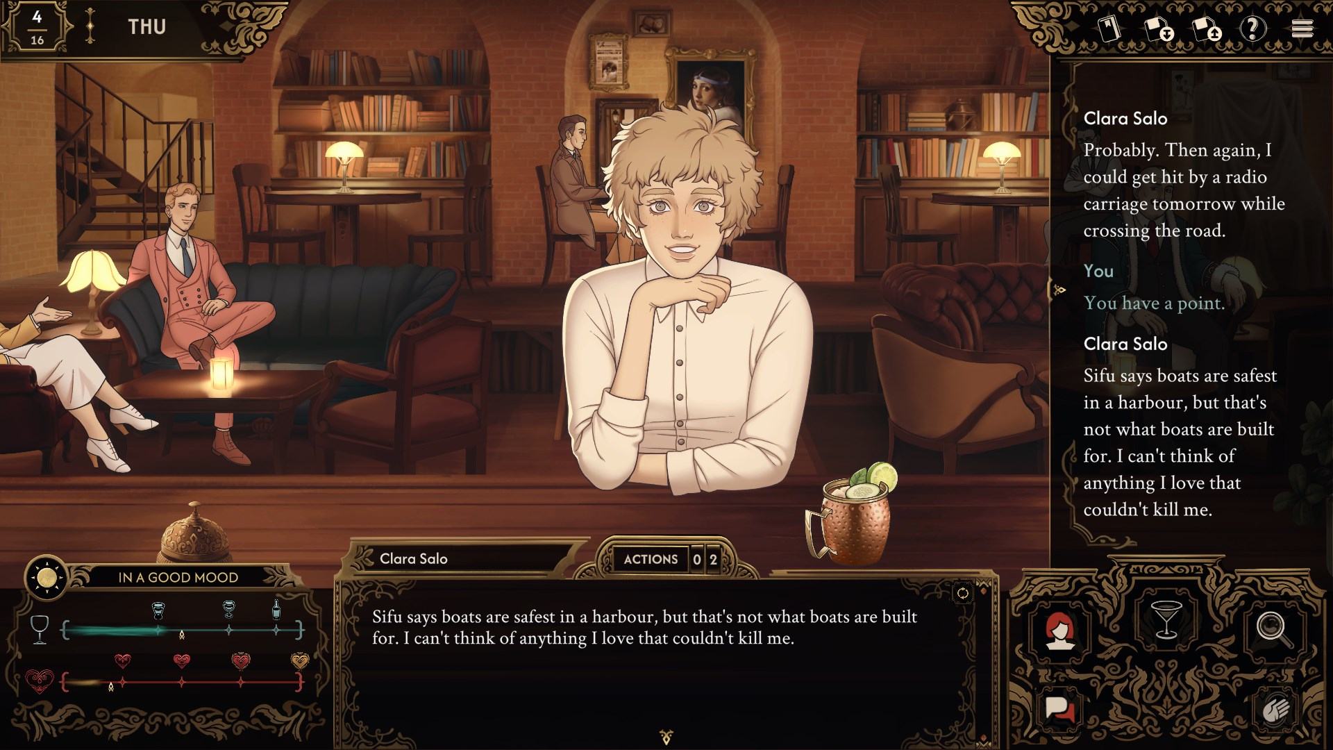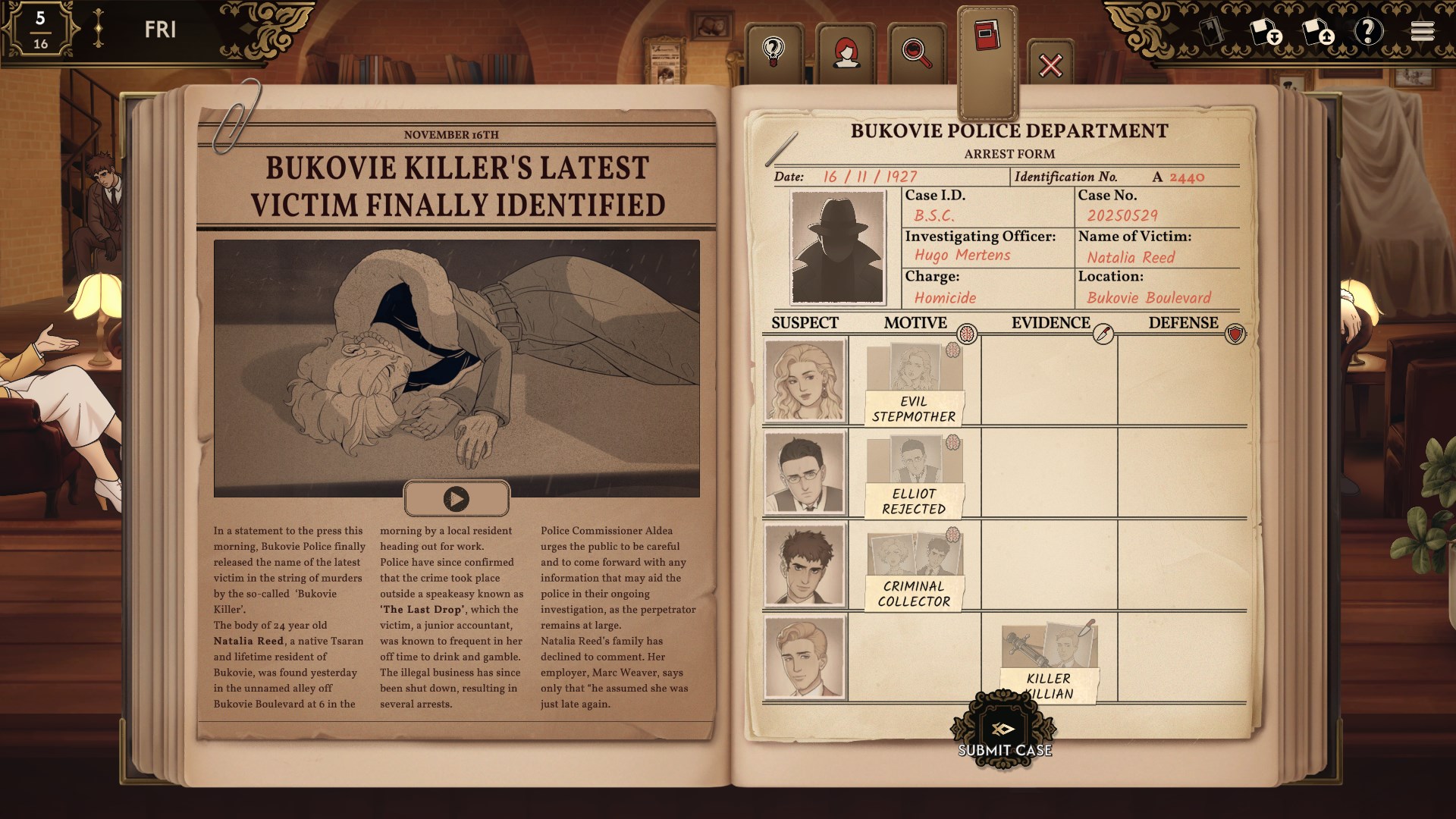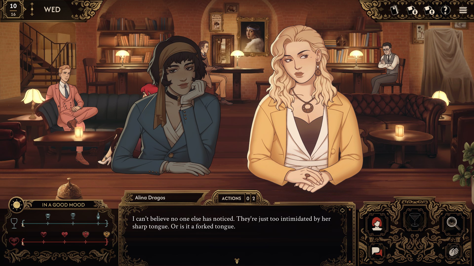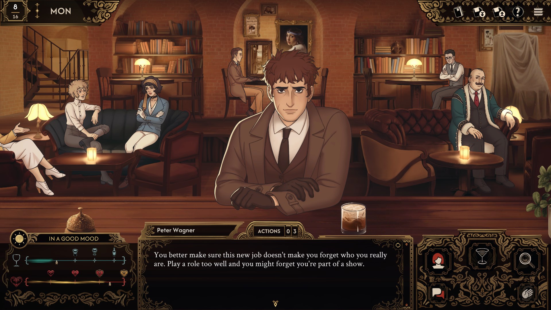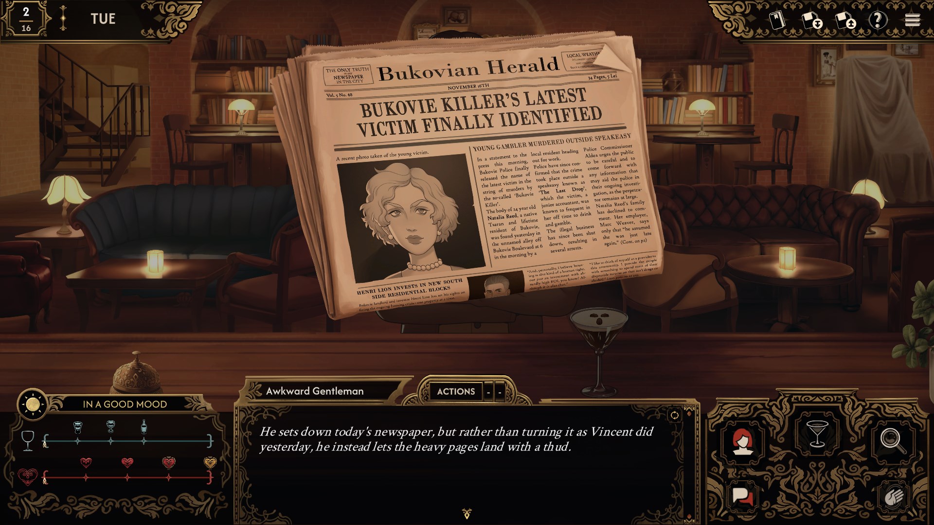 Höre dir die Geschichten deiner Gäste an und erfahre mehr über ihr Leben, während du ein Rätsel löst, das jede Schicht der Gesellschaft von Bukovie berührt, von den betrunkenen Dandys, die für Cocktails mit Geld nur so um sich werfen, bis hin zu den korrupten Polizisten und zwielichtigen Gestalten, die versuchen, dich in ihre undurchsichtigen Machenschaften hineinzuziehen.