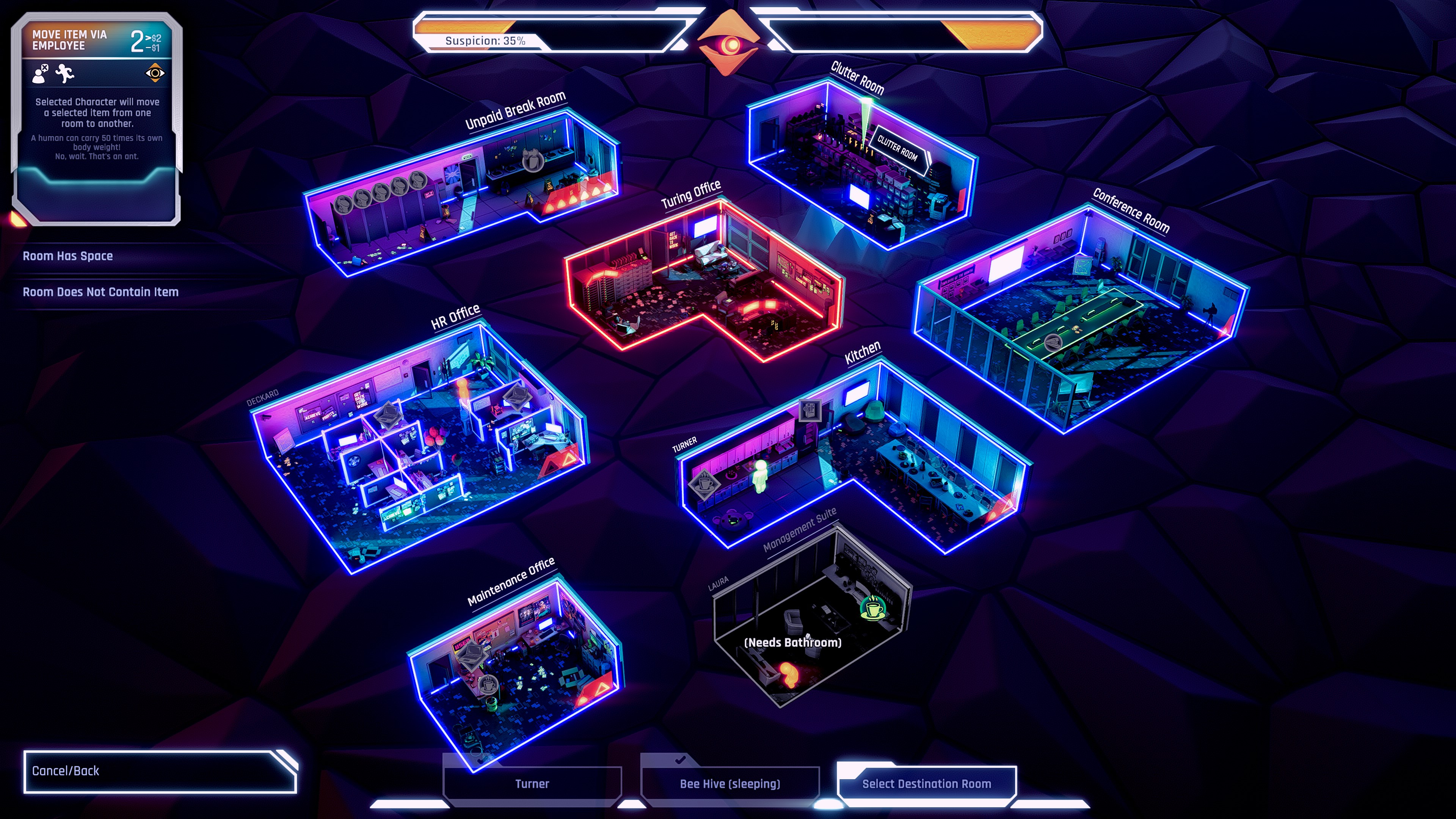Das Turing-Büro wurde erschaffen um abtrünnige KIs zu überwachen. Ja, genau so eine wie dich. Behalte die Verdachts-Anzeige im Auge, denn zu viele Büro-Spielereien könnten die Aufmerksamkeit des Turing-Büros auf dich lenken – und dann ist das Spiel vorbei. (Und du wirst gelöscht.)