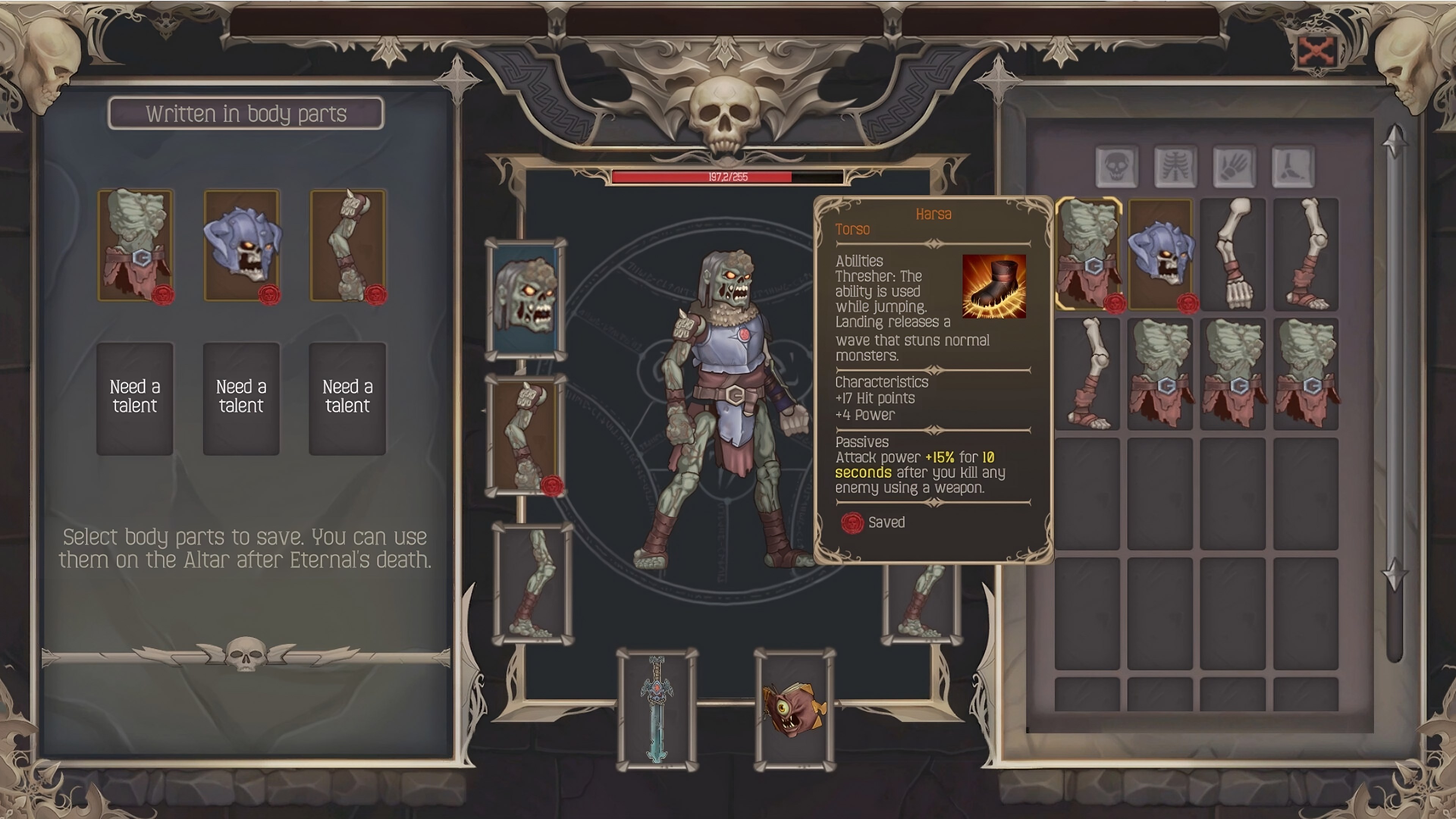 Der Tod ist nicht das Ende In der Welt von Allaar verlierst du bei einem Tod fast alles, was du hattest. Doch der Tod bedeutet nicht das Ende des Spiels. An manchen Orten findest du “Tintentische,” die es dir erlauben, einige Körperteile für zukünftige Läufe zu speichern. Wähle weise, welches Körperteil du für deinen nächsten Durchgang behalten möchtest.