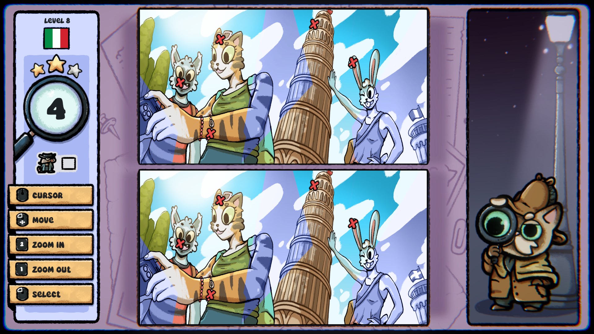 Die berüchtigte Cheddar-Mafia verbreitet Chaos auf der ganzen Welt, und nur SpotCat kann sie aufhalten. Erkunde lebendige, handgezeichnete Szenen aus verschiedenen Ländern, finde die subtilen Unterschiede und bleib wachsam – Mafiaratten können jederzeit auftauchen.