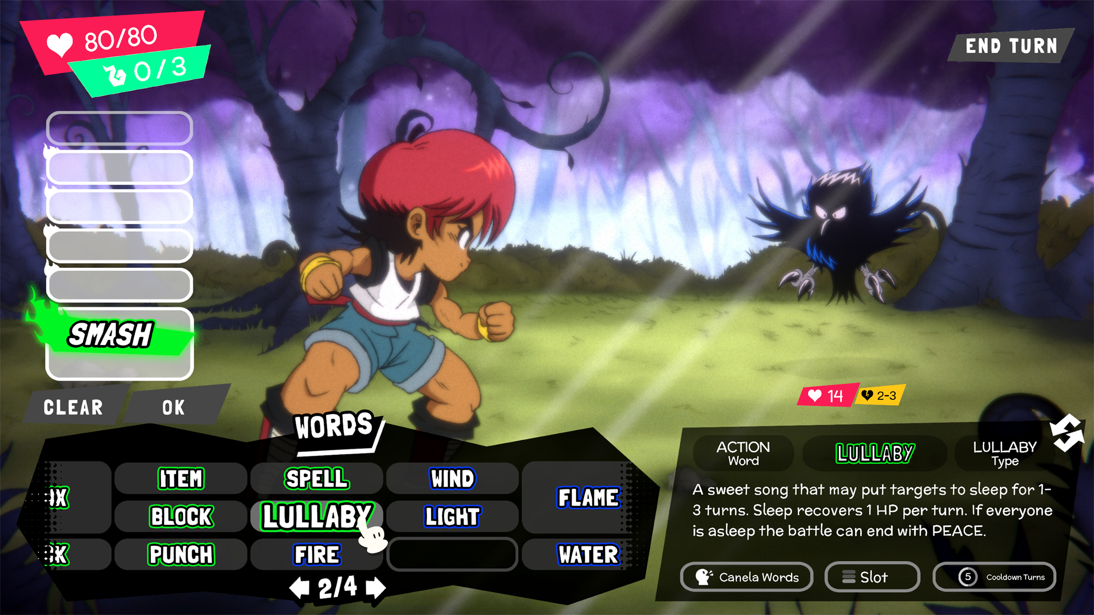Alle Wörter haben Abklingzeiten, und Gegner können entweder schwach oder stark gegenüber bestimmten Angriffen oder Elementen sein. Da du das aber erst im Kampf gegen sie herausfindest, musst du darauf vorbereitet sein, dein Improvisationstalent einzusetzen.