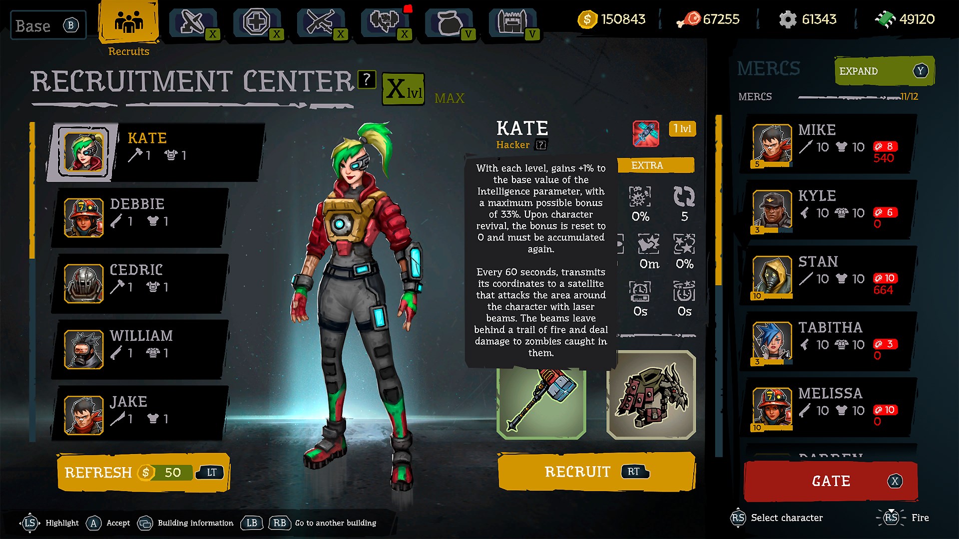 Entwickle dein Überlebenden-Lager, um Buffs freizuschalten. Verbessere die Fähigkeiten deiner Söldner in der Trainingshalle, rekrutiere neue Truppen in der Söldnerbasis und rüste deine Waffen und Rüstungen in der Werkstatt auf. Verbesserte Gebäude erhöhen deine Überlebenschancen.