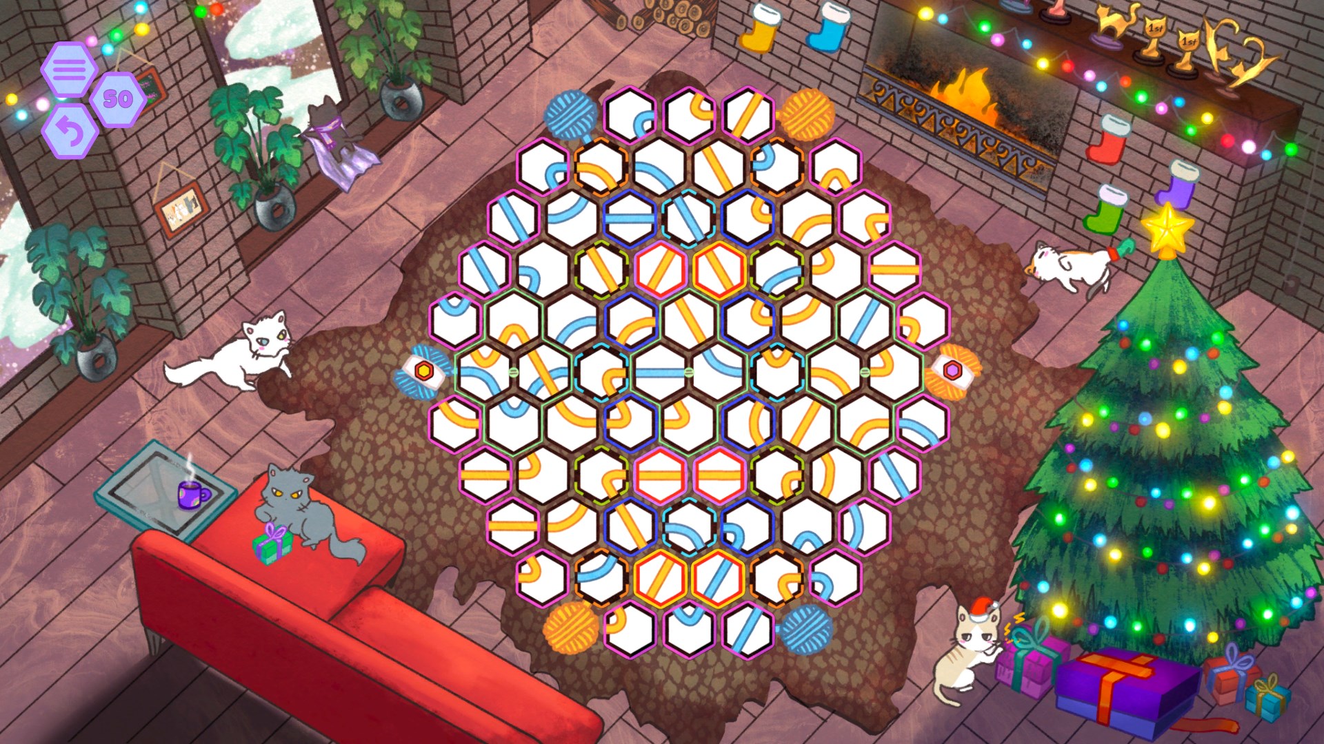 Twist and move hex pieces to connect yarn threads for playful felines. A charming twist on classic hex pipes puzzle!