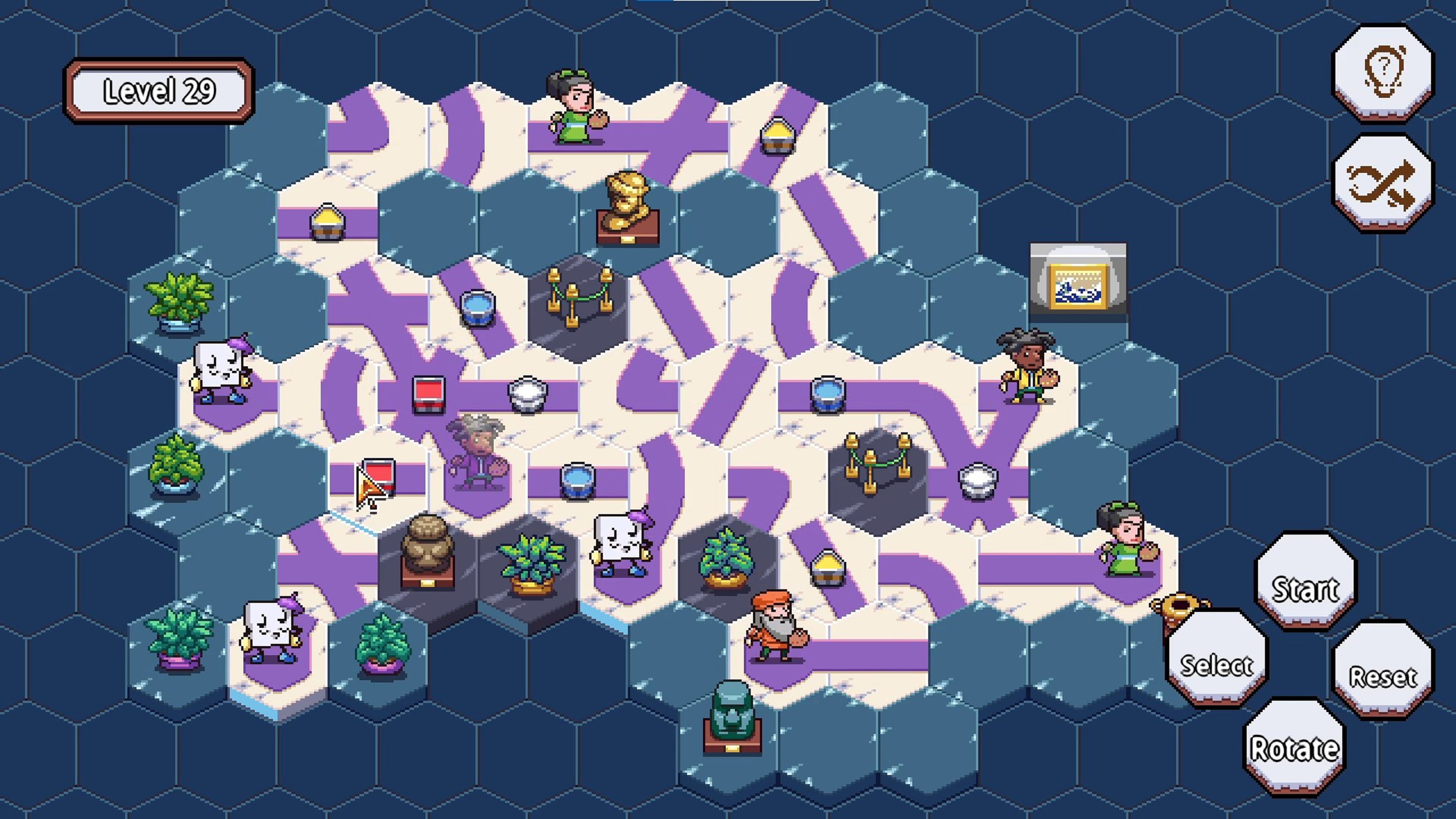 Die Mechanik ist leicht zu erlernen, aber voller Möglichkeiten: Drehe und tausche Fliesen, um den Pfad zu bauen, organisiere Farbeimer und stelle sicher, dass die Leinwand an den Malern mit der richtigen Farbe vorbeigeht. Wenn die Reihenfolge falsch ist, schlägt das Malen fehl und das Level ist verloren.
