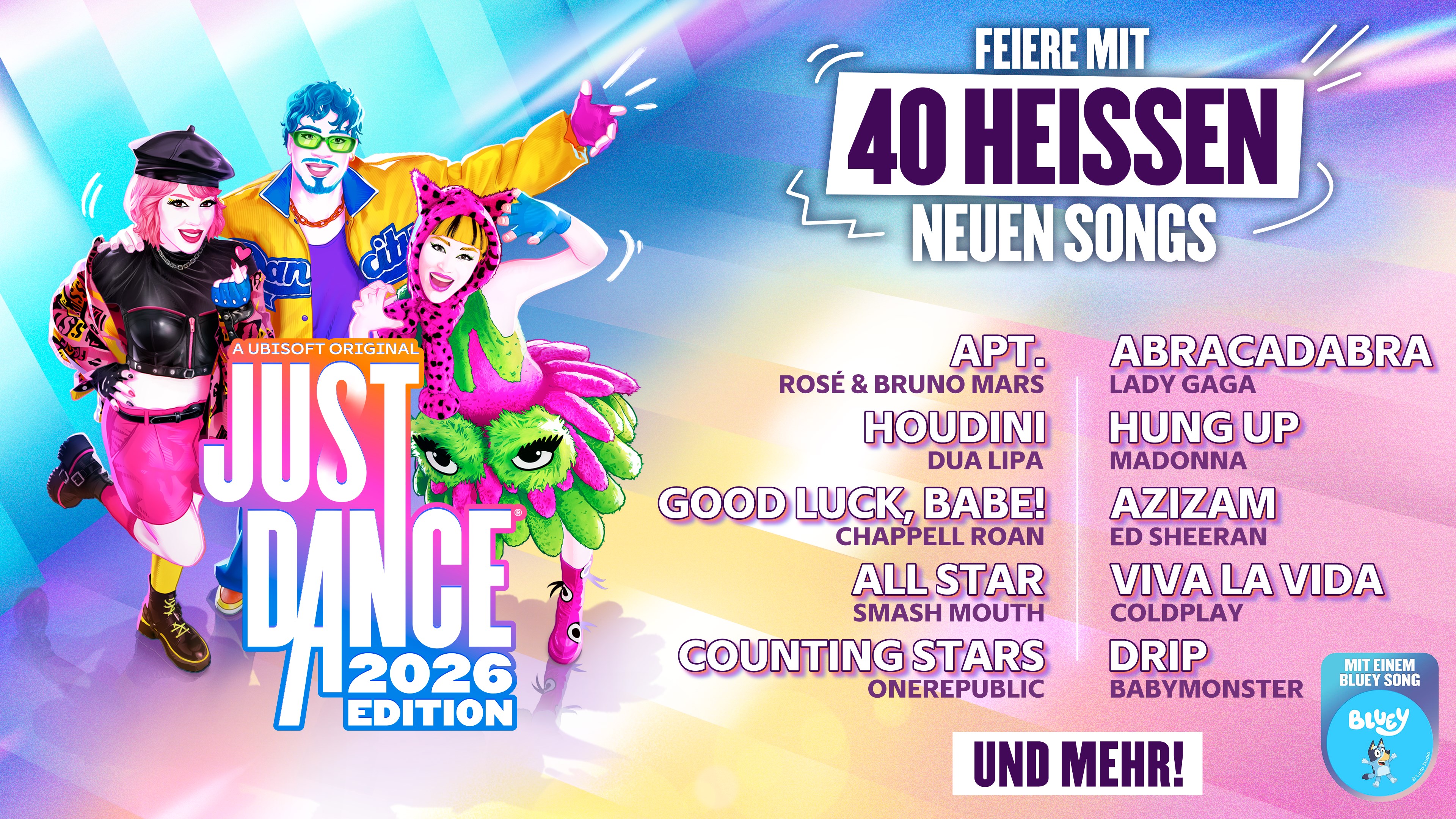 **Just Dance+ ist ein Streaming-Service, der über Just Dance 2026 Edition spielbar ist und Zugriff auf zusätzliche Songs gewährt. Es gelten die Nutzungsbedingungen. Erfordert ein Ubisoft-Konto, ein Konsolen-Konto, eine permanente Internetverbindung sowie die Zahlung einer Gebühr und/oder einer regelmäßigen Abo-Gebühr. Es gelten Einschränkungen aufgrund des Alters und der Region.