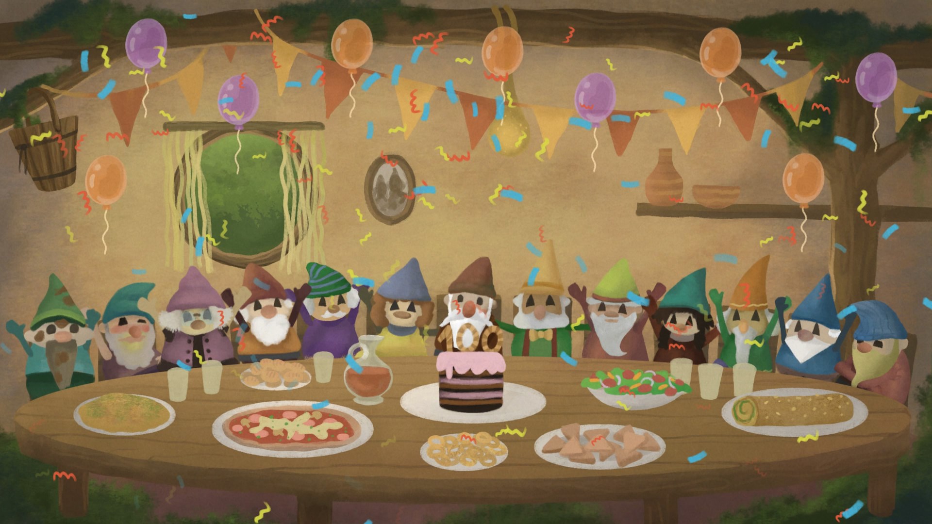 In einem Gnom-Dörfchen in einem Wunderwald … wartet ein Gnom-Großväterchen auf seine Familie, damit er seinen 100. Geburtstag feiern kann.