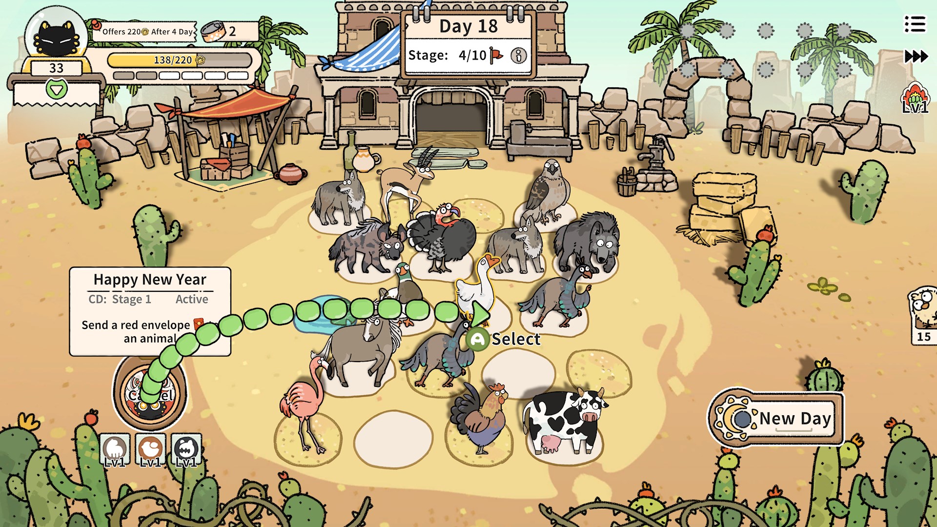 Übernimm die Rolle des Ranch-Managers und entwickle deine kleine Herde zu einer, die den Katzen-Gott beeindrucken kann! Wähle deinen eigenen Weg, aber am Ende jeder Woche steht eine Prüfung: bringe dem Katzen-Gott Opfer dar oder riskiere seinen Zorn.