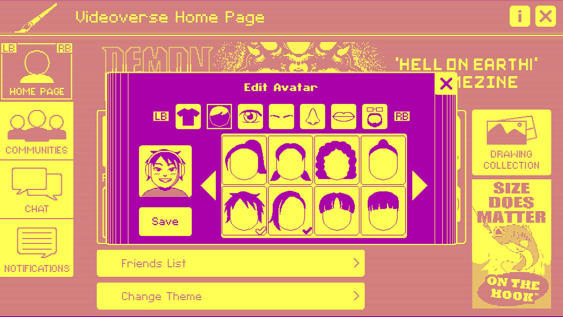 Triff eine Vielzahl von Charakteren, schalte mehrere Nebenhandlungen frei, genieße die Pixel-Kritzeleien und entdecke die Wahrheit hinter dem angeschlagenen sozialen Gaming-Netzwerk! Personalisiere dein Videoverse-Erlebnis, indem du deinen Avatar, dein persönliches Zitat und dein Lieblingsthema wählst.