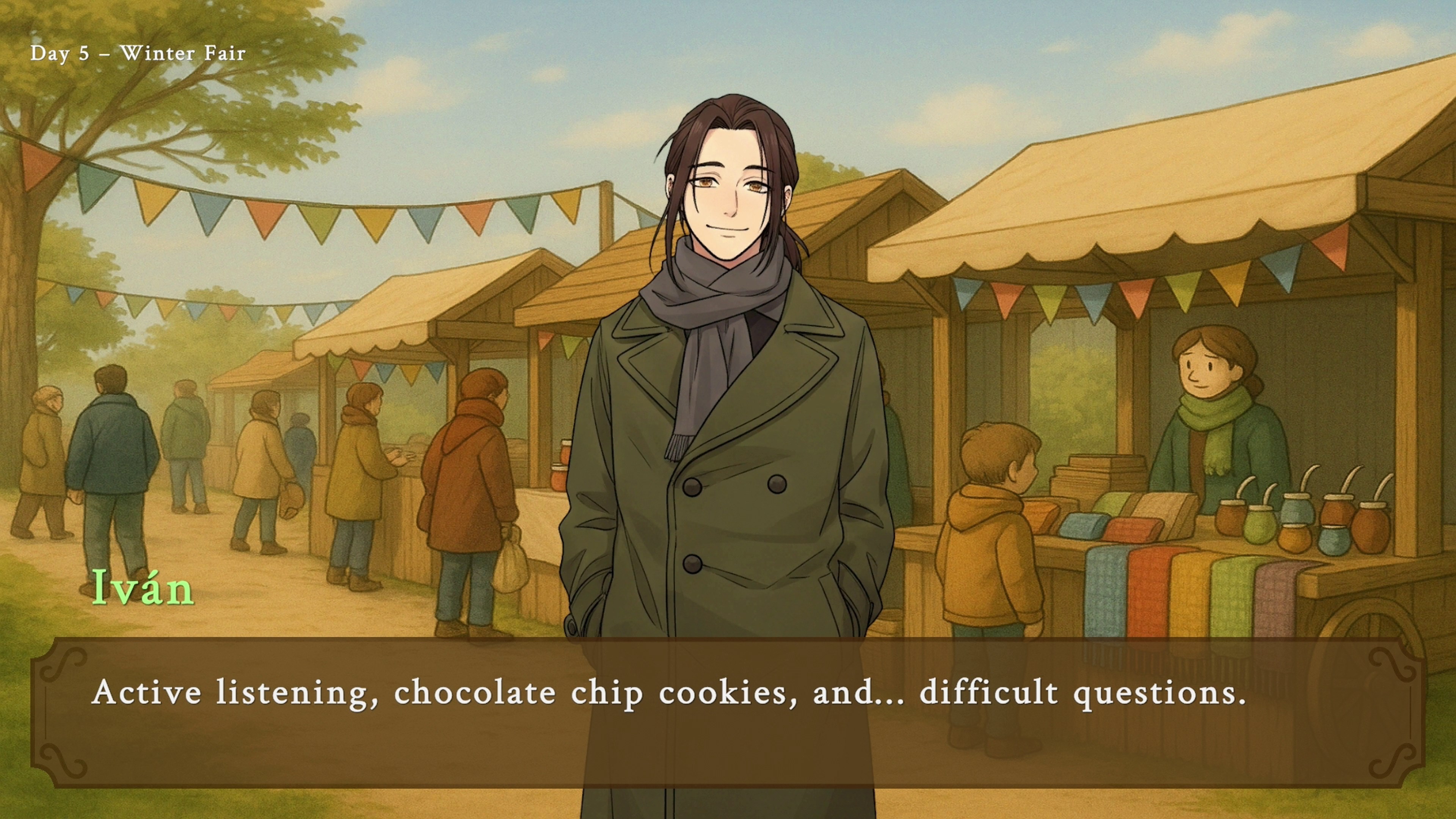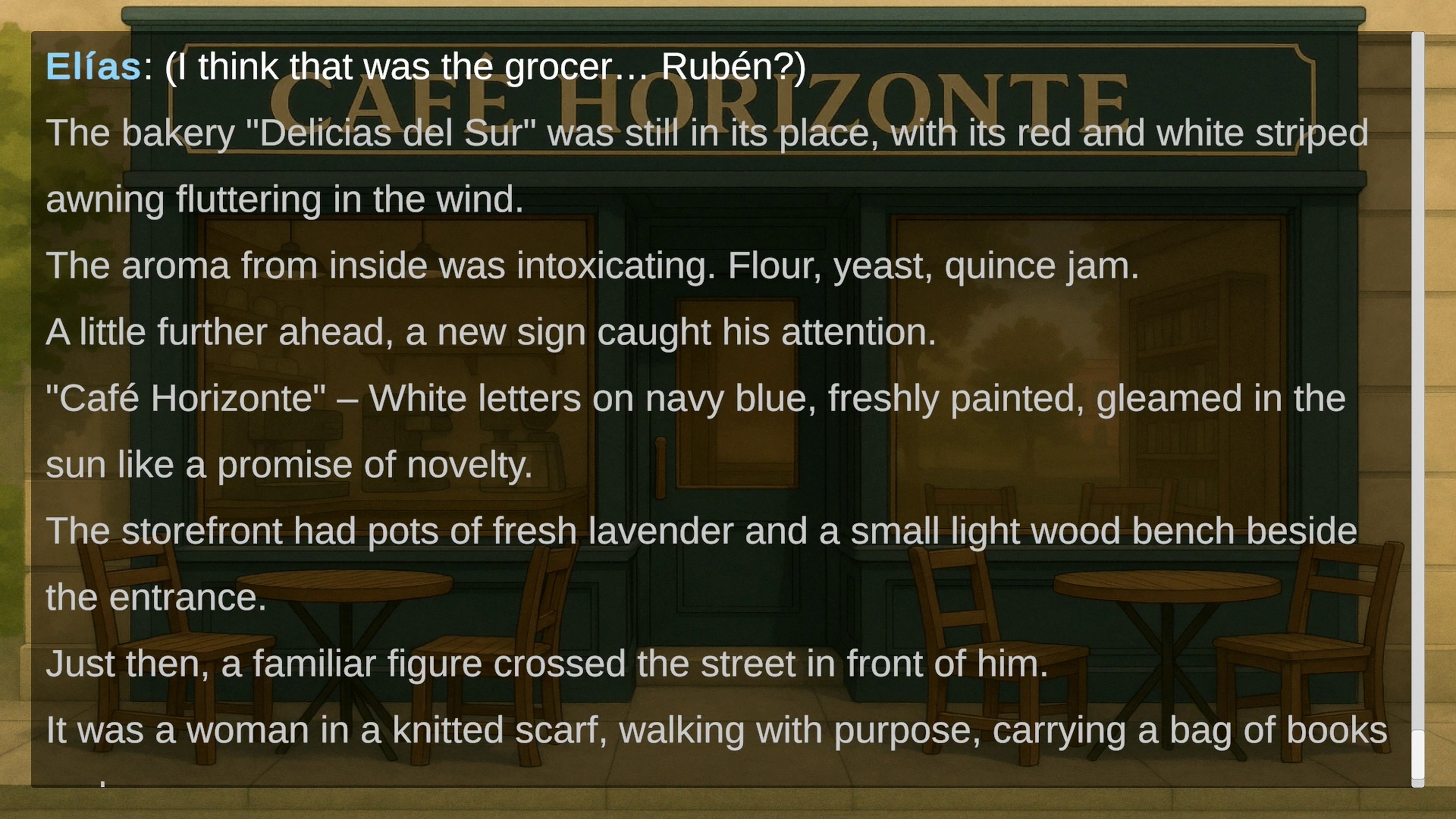 Als Elias in die Küstenstadt zurückkehrt, die ihm einst Schutz bot, wird er in einen langsamen Winter der Verbindung, Erinnerung und stillen Entscheidungen gezogen. Übernimm die Rolle dieses jungen Mannes und leite seine Entscheidungen, umgeben von der Wärme junger und alter Stadtbewohner, die oft in einer Buchhandlung bei einem gemeinsamen Kaffee Gespräche führen.