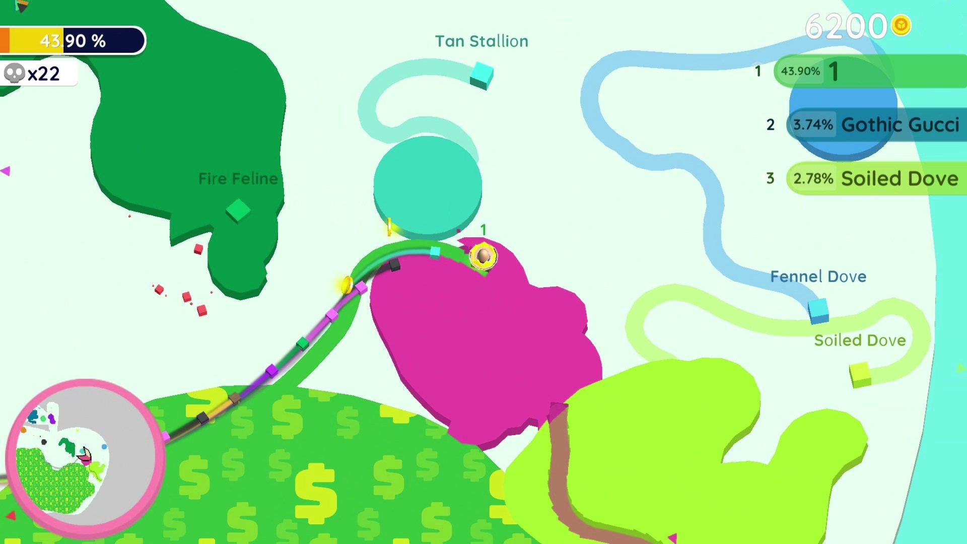Färbe die Karte in deiner eigenen Farbe, eliminiere deine Gegner, hol dir die höchste Punktzahl und erobere die Welt von Paper io.