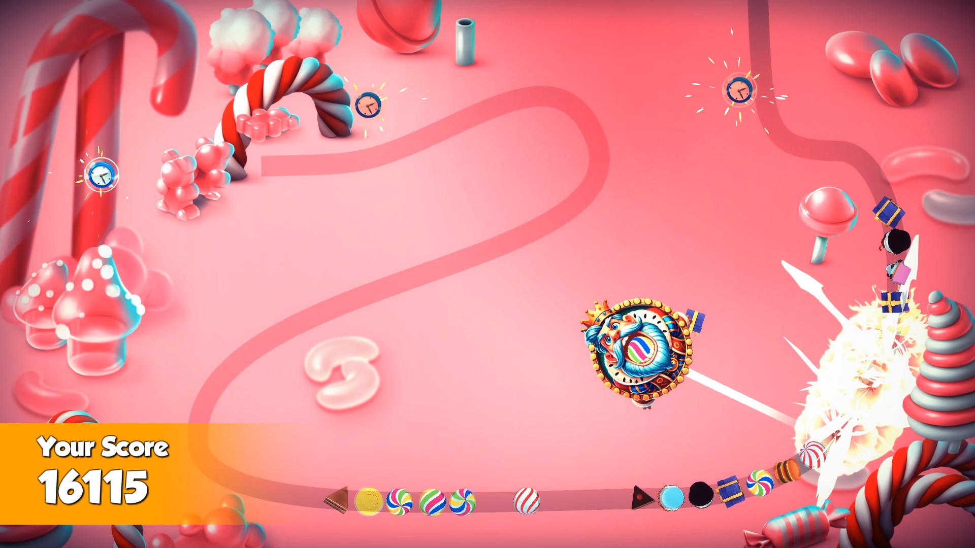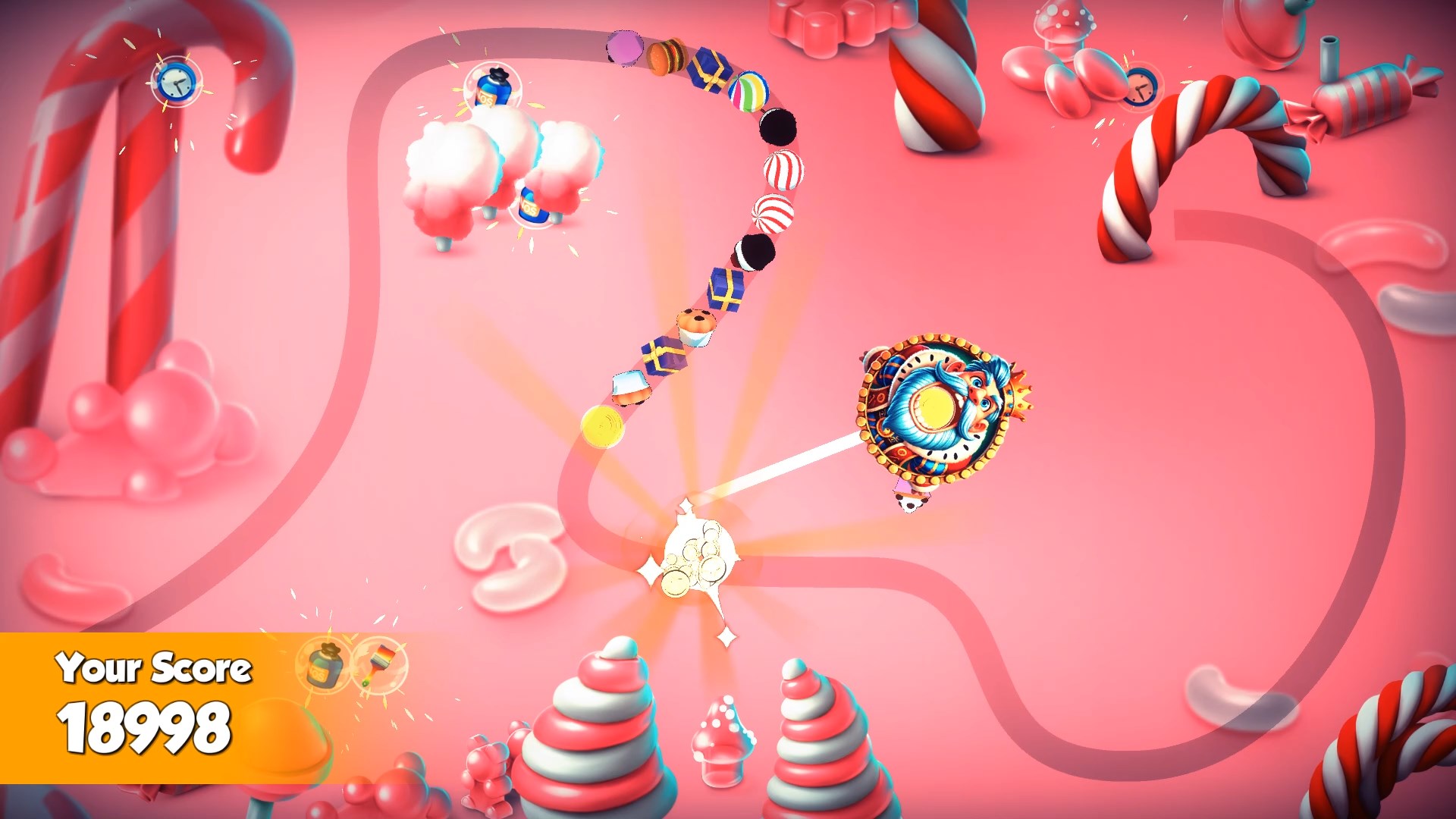 Gib deine süßen Münzen zwischen den Levels aus, um leckere Upgrades freizuschalten: Süßer Sturm fegt Klumpen weg, Zeitstopp hält vorrückende Süßigkeiten an, Farbtausch verwandelt deine nächste Murmel in eine beliebige Geschmacksrichtung, Zuckerschauer lässt perfekte Kombinationen herabregnen, Einzelkugel entfernt eine hartnäckige Süßigkeit und Zeitumkehr macht deinen letzten Schuss rückgängig für eine zweite Chance.