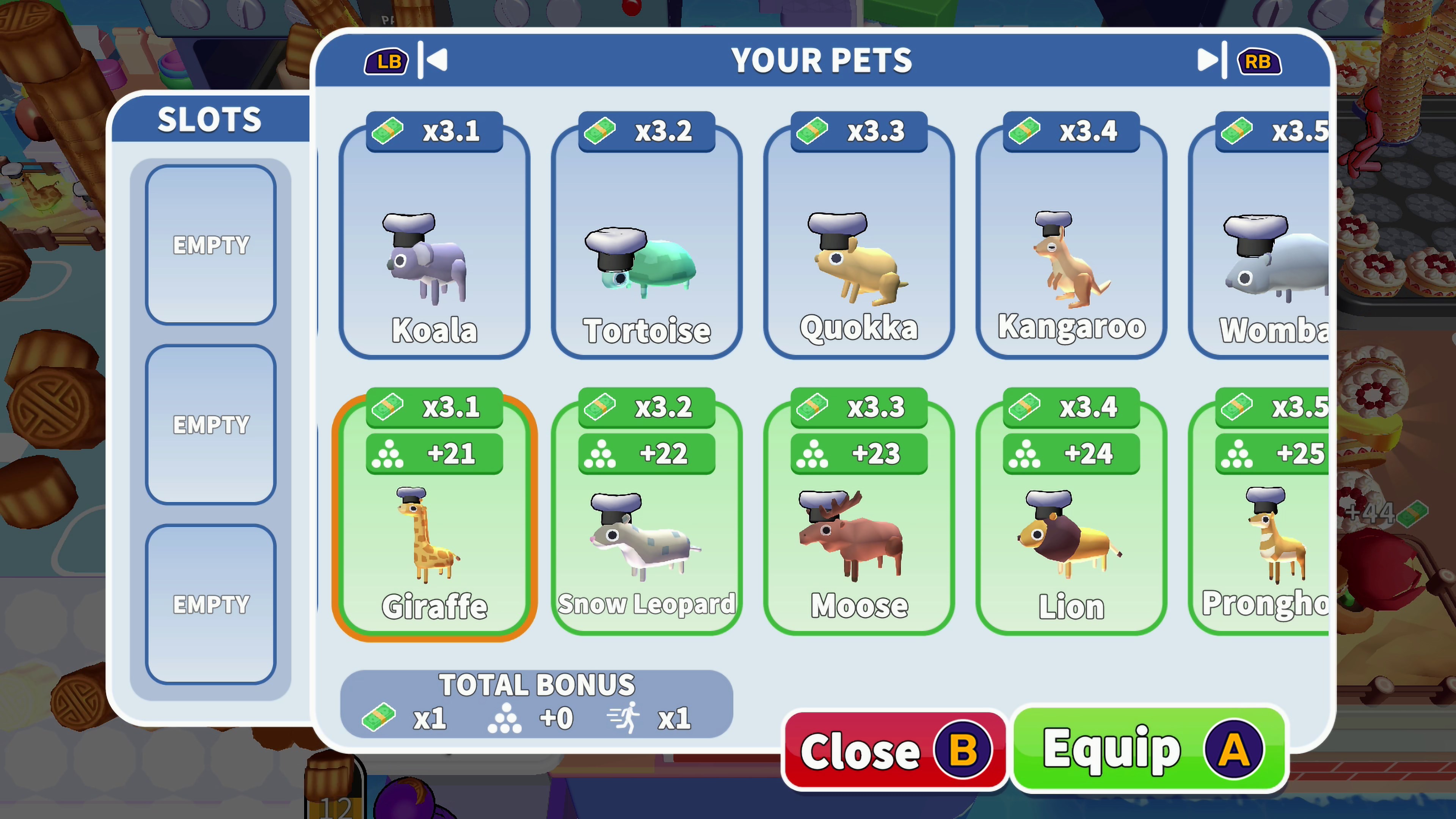 - Verbessere deinen Charakter und deine Arbeiter, damit sie schneller laufen oder mehr Gebäck tragen können!