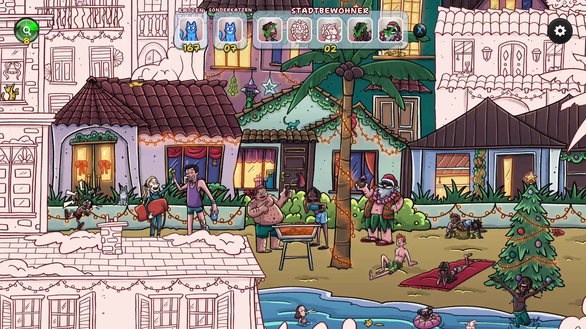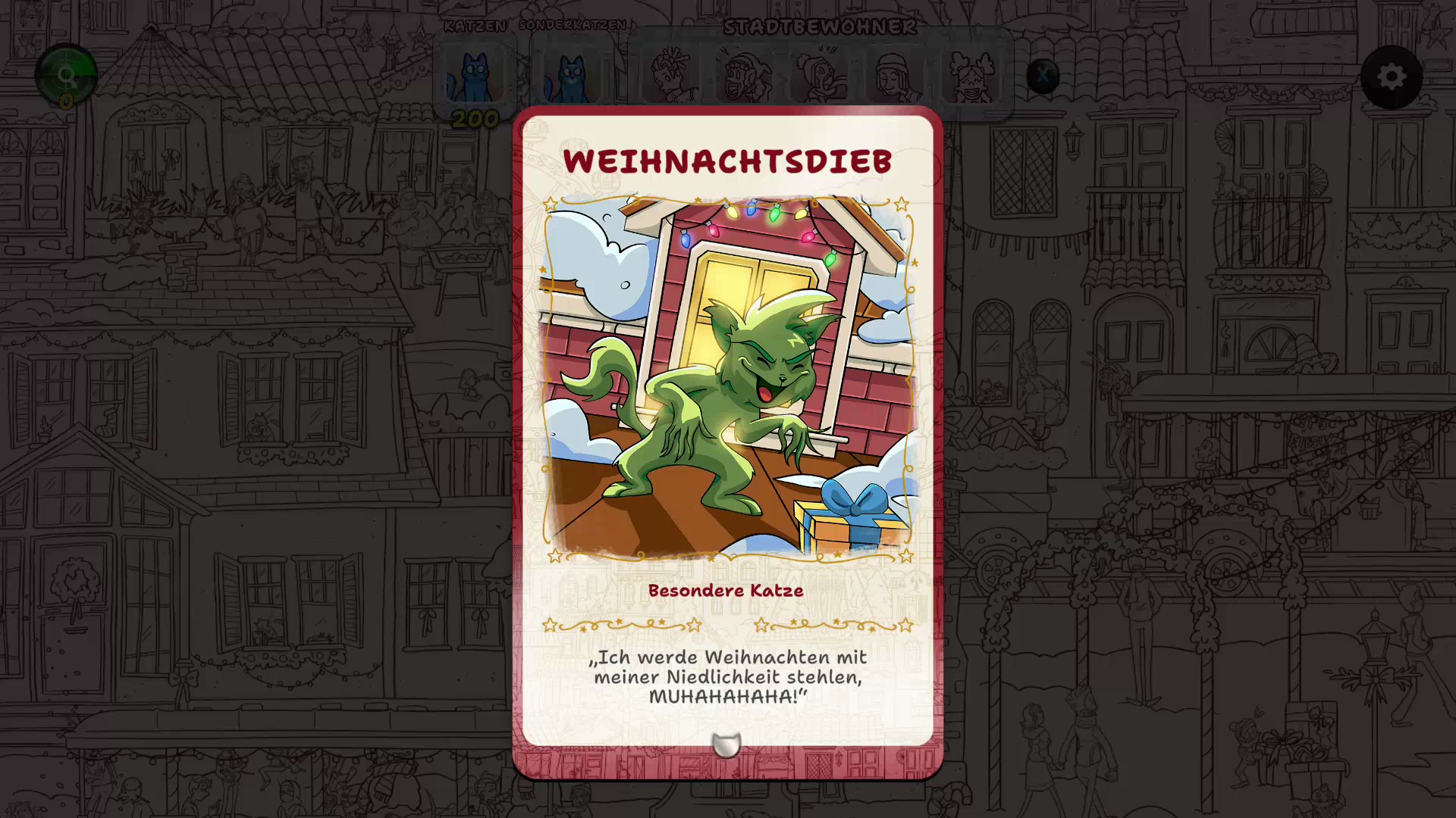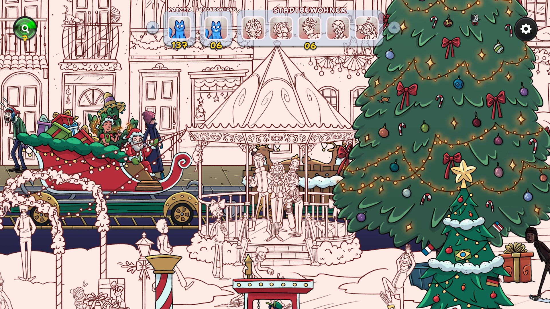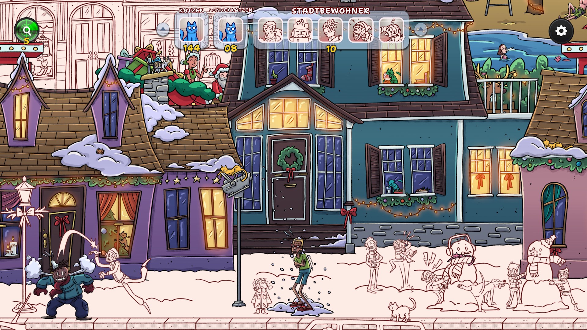 Erlebe, wie ein verschneites, graues Winterdorf allmählich in weihnachtlichen Farben erstrahlt, während du mehr als 900 versteckte Katzen und traditionelle Figuren aus aller Welt entdeckst.