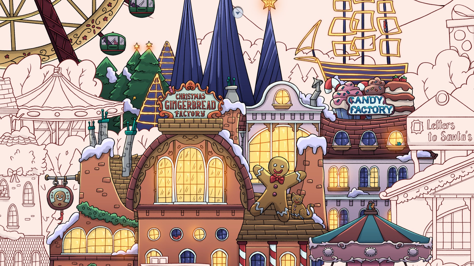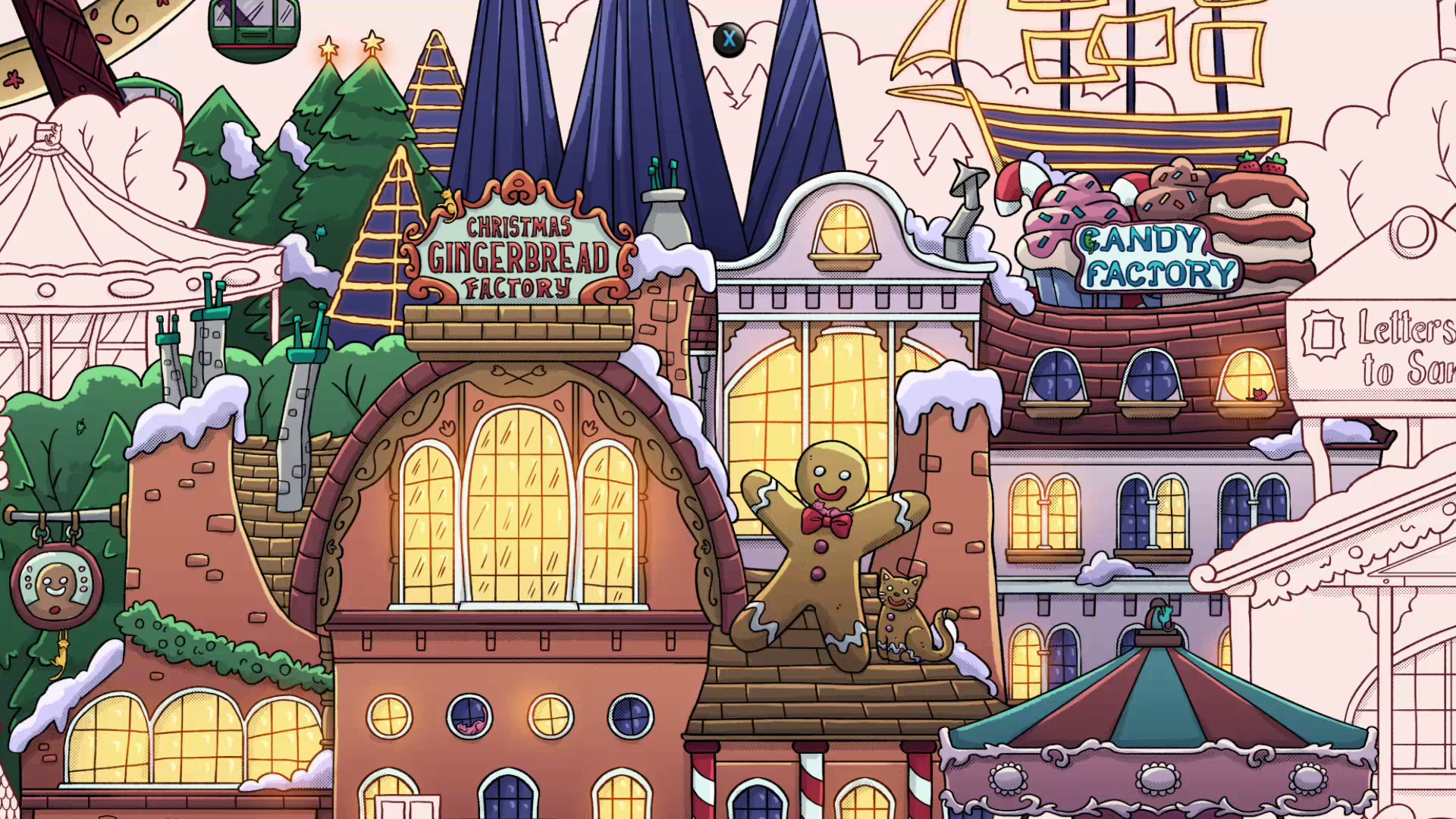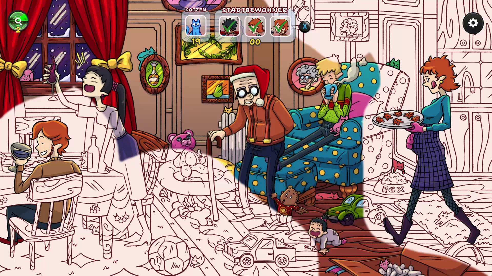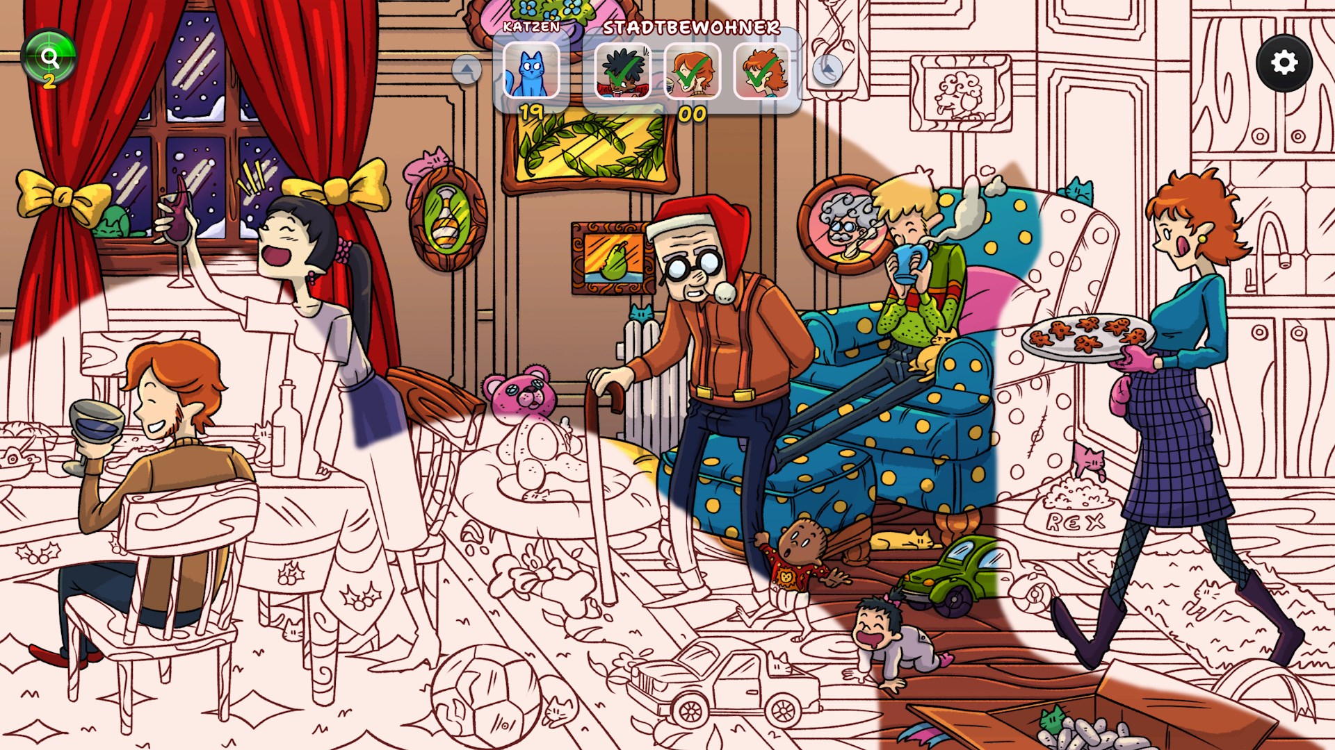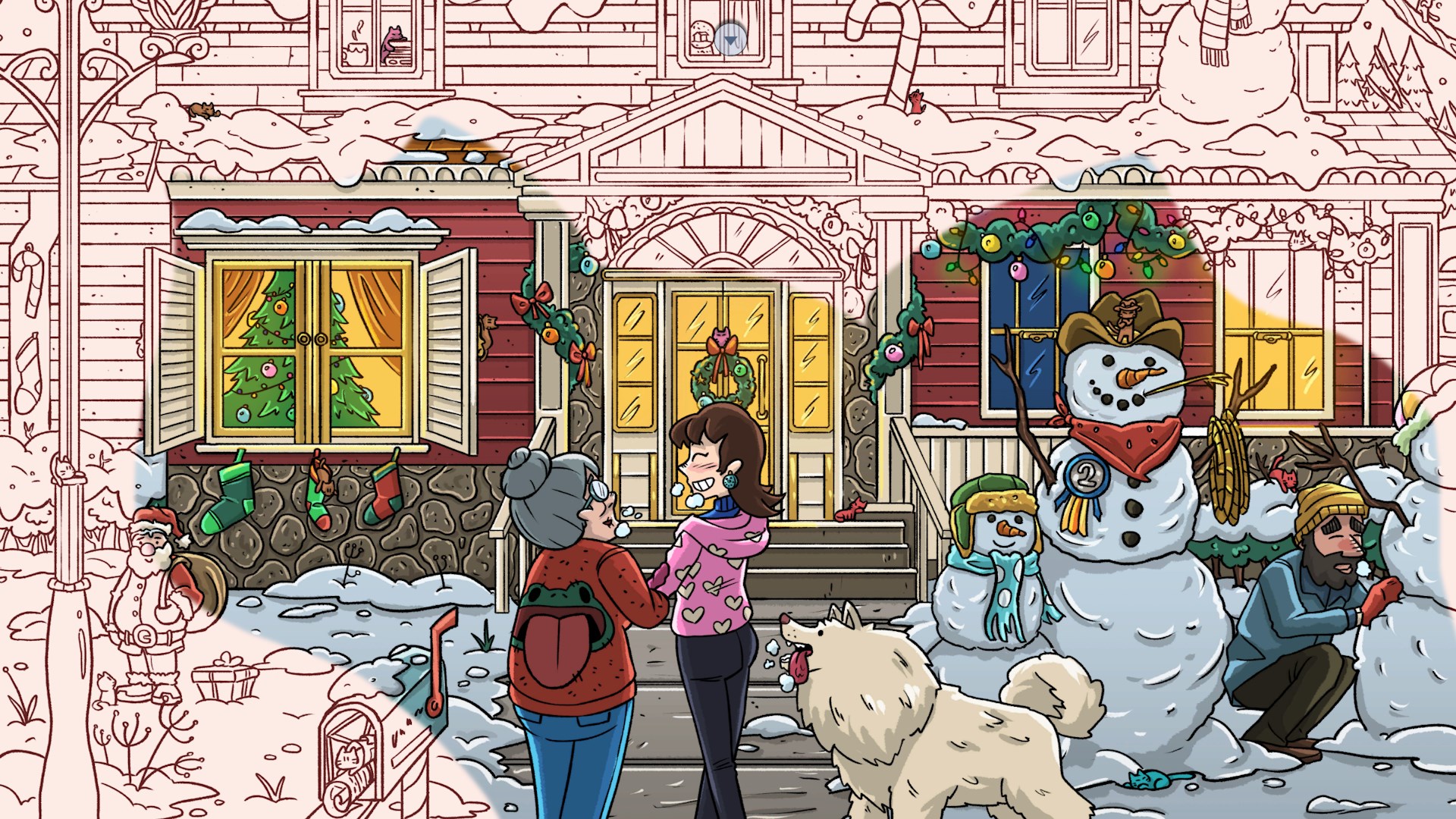 Erlebe, wie ein verschneites, graues Winterdorf allmählich in weihnachtlichen Farben erstrahlt, während du mehr als 900 versteckte Katzen und traditionelle Figuren aus aller Welt entdeckst.