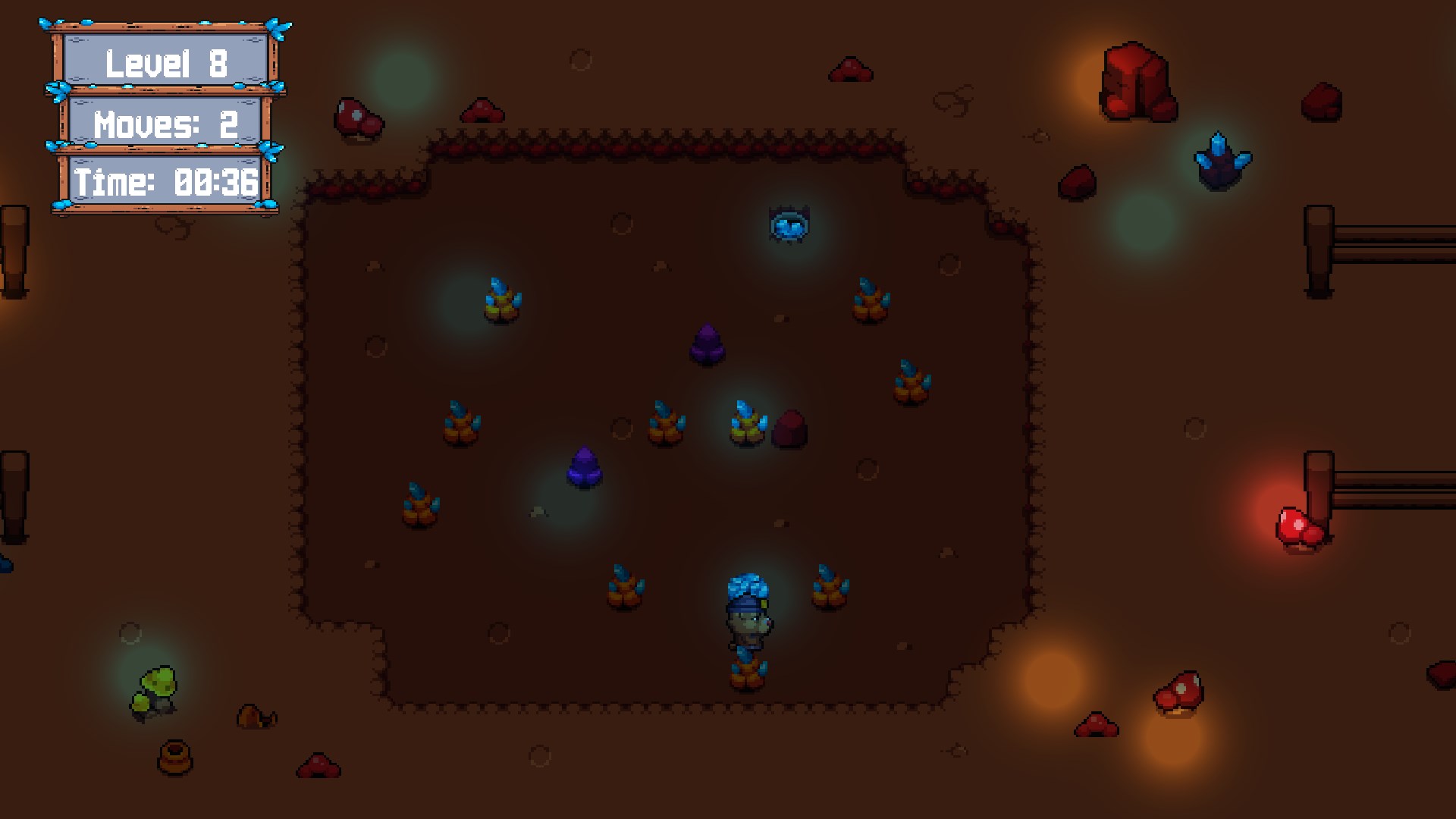 Der Bär braucht die blauen Edelsteine. Edelsteine anderer Farben zerbrechen sehr leicht. Sie eignen sich nicht zum Verkaufen und erschweren die Arbeit des Bären zusätzlich. Achte darauf, wie sie zerbrechen und den Weg blockieren.