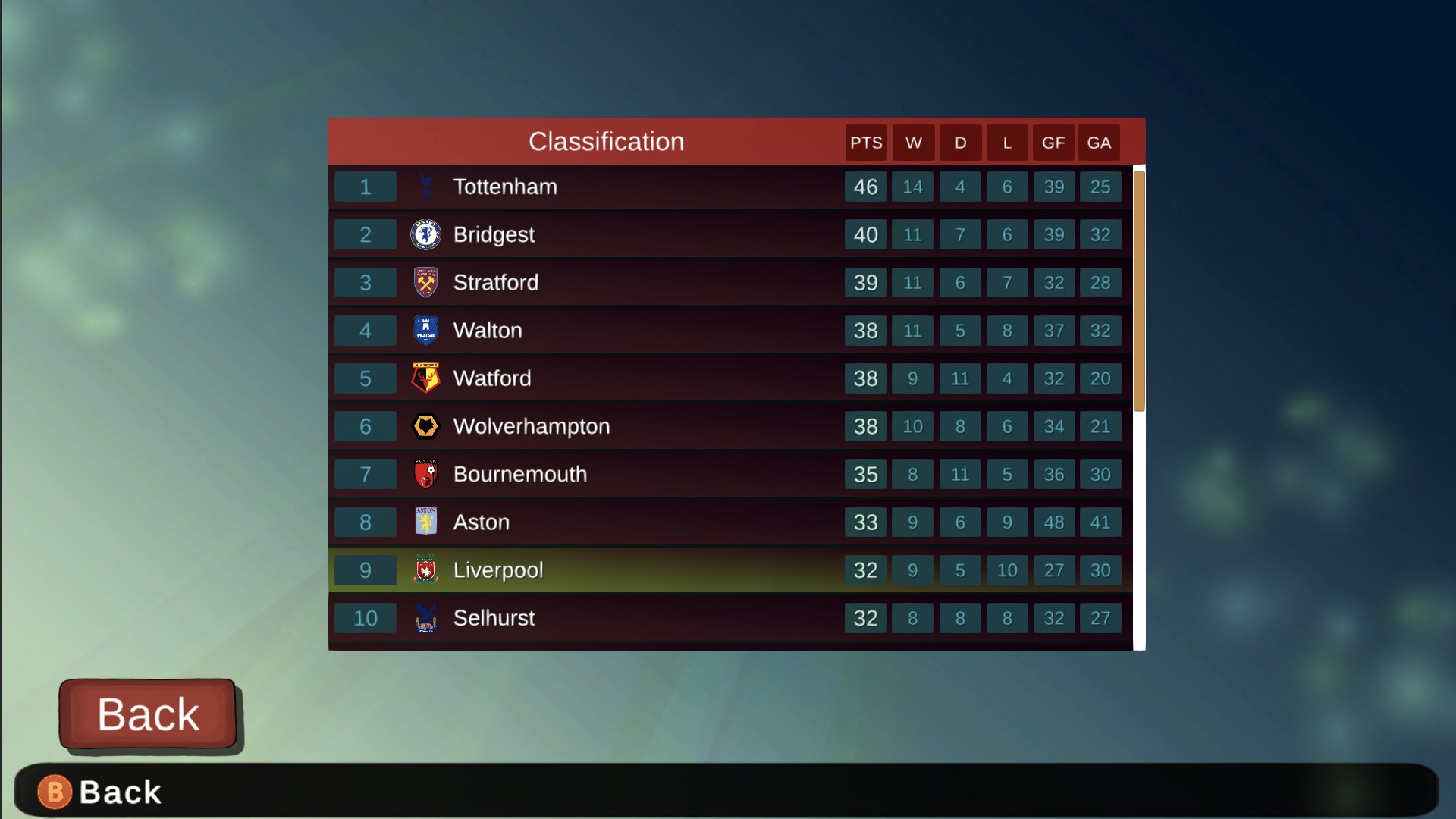 – Spieler haben 7 Fähigkeiten (Schießen, Passspiel, Kopfballstärke, Stärke, Ballkontrolle, Ausdauer und Geschwindigkeit)