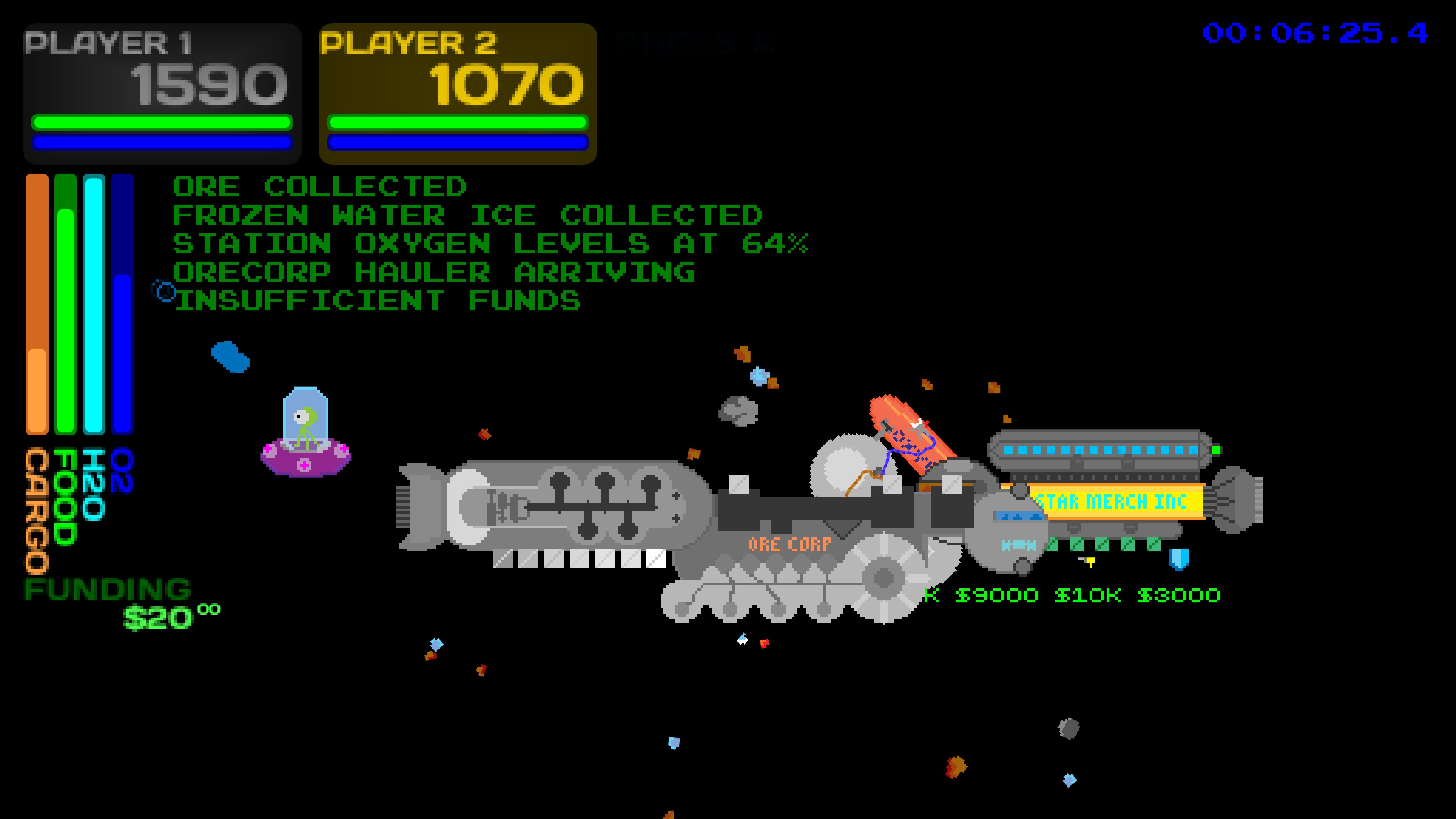 Abbauen. Schießen. Sammeln! Reparieren. Komisches und unterhaltsames Roguelike-Einzelspieler- oder Partyspiel im 2D-Retro-Arcade-Stil! Couch-Koop-Abenteuer im Weltall als Asteroidenbergmann! Apolune 2 ist ein urkomisches und schockierendes Ressourcenmanagementspiel, in dem ein oder mehrere Spieler das Leben in einem Asteroidenbergbauteam im Weltraum erleben. Tauchen Sie ein in das Leben eines Asteroidenbergmanns von OreCorp. Es ist eine Galaxie voller Möglichkeiten, darunter: Waffen, Aliens, Asteroiden, Weltraumpiraten, Händler und ... EISCREME! Apolune 2 ist ein eigenständiges Abenteuerspiel für Einzelspieler und lokalen Koop, das im Asteroidengürtel spielt. Sie und Ihr Astronautenteam sind Asteroidenbergleute auf einer Mission, um Weltraumgeld zu verdienen, zu überleben und im Weltraum erfolgreich zu sein. Füllen Sie die lokalen Highscores, um Ihre Freunde und Familie zu einem fantastischen Erlebnis herauszufordern. Sammeln Sie Ressourcen, kaufen Sie Upgrades und bekämpfen Sie Aliens und Weltraumpiraten! Apolune 2 ist ein Controller-freundliches Spiel, das kinderleicht zu erlernen ist.