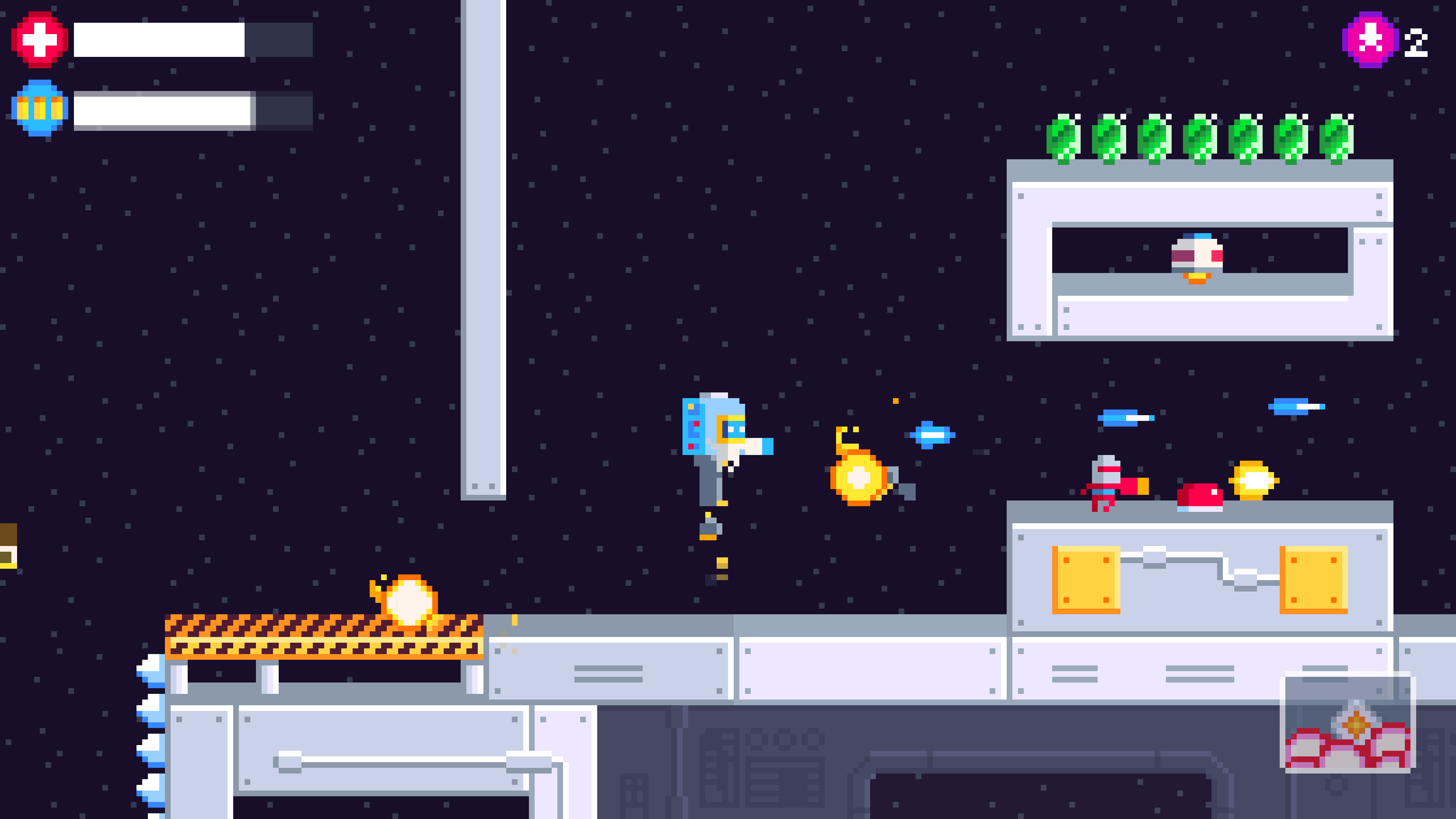 Bewaffne dich bis an die Zähne und baller in diesem Side-Scrolling-Shooter und -Plattformer deine Gegner Zone für Zone nieder! Am Ende jeder Zone erwartet dich ein total gerechtfertigter Bosskampf (hey, es ist immerhin ein Videospiel), der dir alles abverlangen wird! Pack also dein ganzes Arsenal ein: Primärwaffe, Sekundärwaffe, Schilde, einen Spezialangriff und alles, was sonst noch knallt!