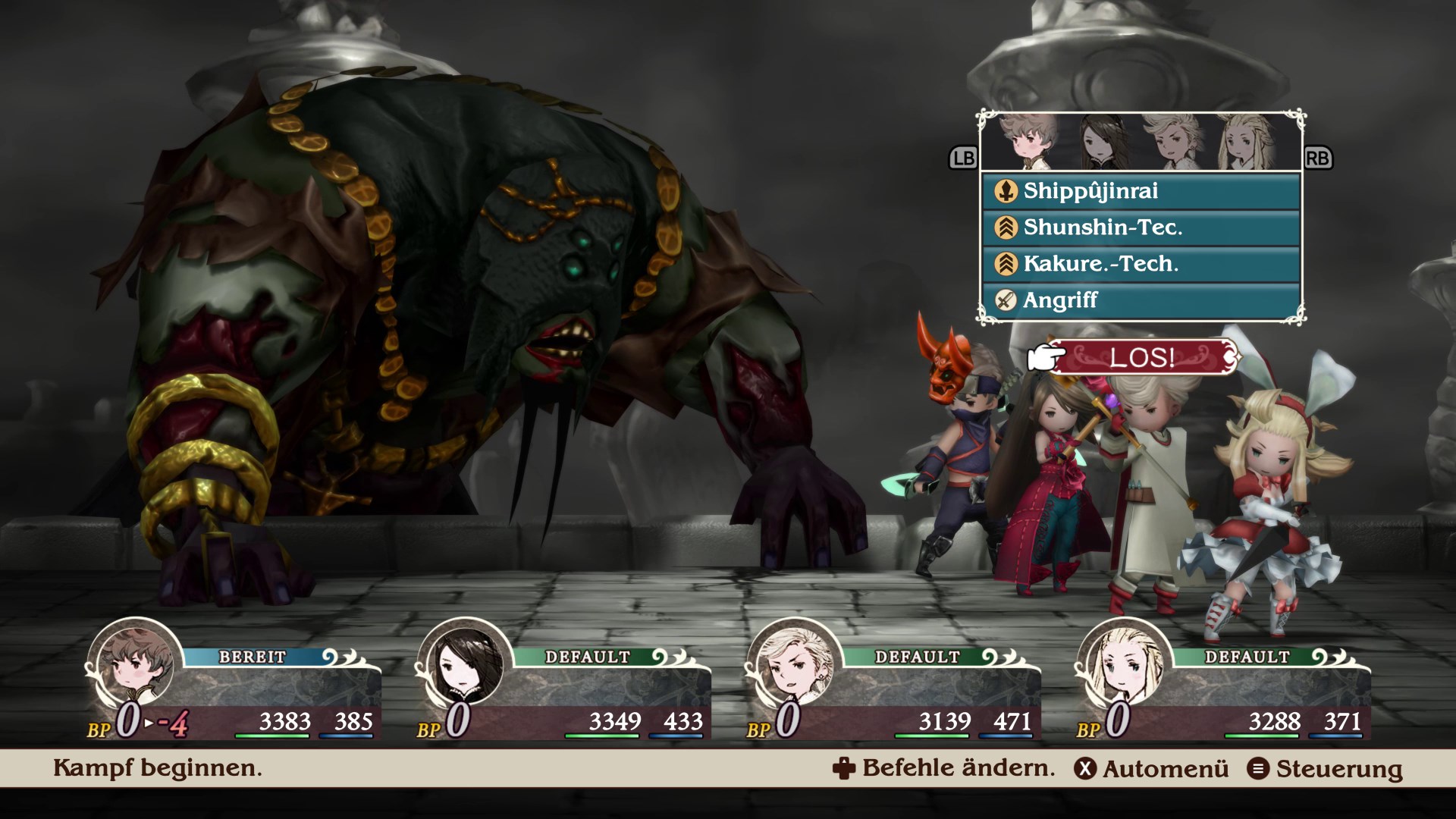 Welche Befehle du wählst, in welchem Stil du kämpfst und wie viele Aktionen du ausführst – das tiefgründige und mitreißende Kampfsystem bietet dir eine Fülle von Taktiken. Zwei Befehle machen das Kämpfen zu einem besonderen Vergnügen: Setze mit Brave deine BP ein und erhöhe so die Anzahl von Aktionen, die du in einer Runde ausführen kannst, oder stärke mit Default deine Verteidigung und hebe dir deine BP für später auf. Vernichte deine Gegner mit einem Sturm aus Angriffen oder rette dich mit einer Kombination aus wiederbelebenden und heilenden Aktionen aus einer brenzligen Situation.