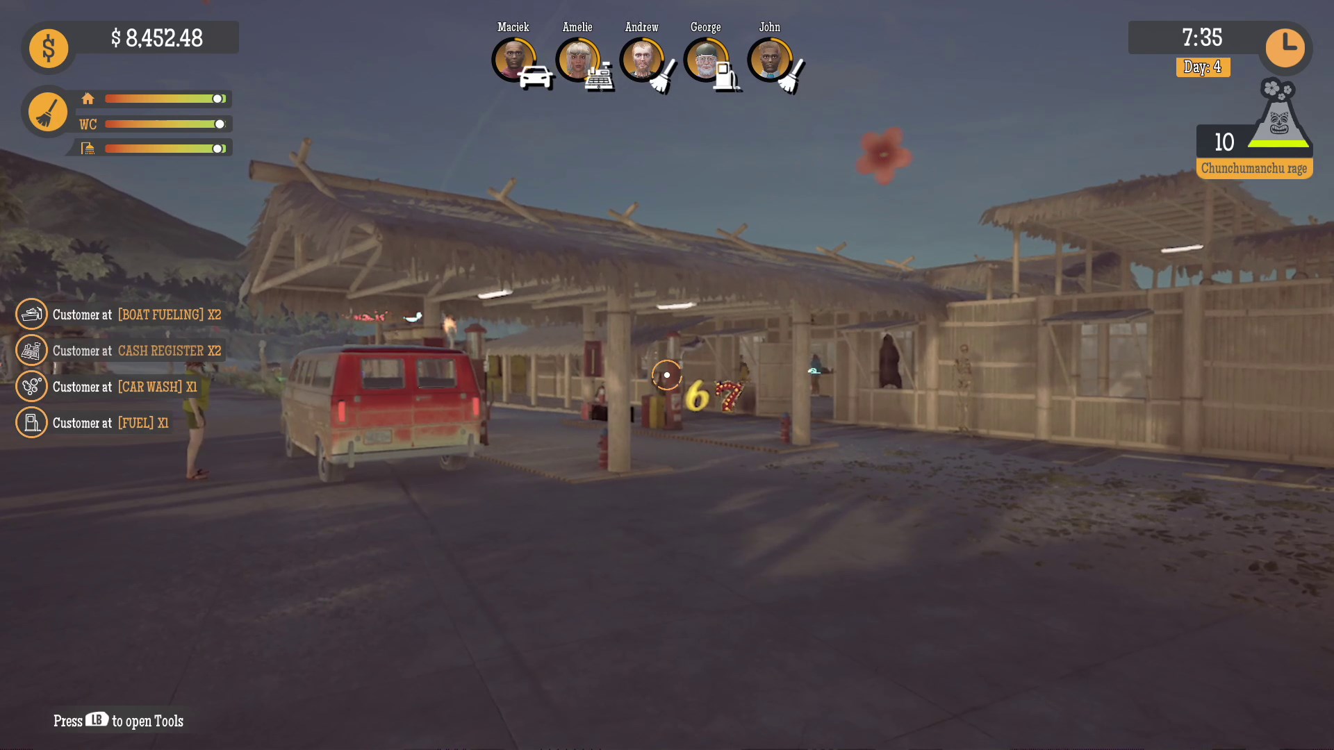 Im DLC „Tidal Wave“ baust du eine neue Tankstelle auf einer abgelegenen, paradiesischen Insel auf – mit eigenen Regeln, neuen Spielmechaniken, einer atemberaubenden Umgebung und Göttern, die beschwichtigt werden wollen.